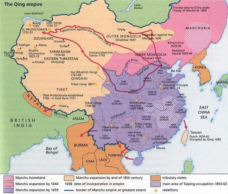 - 청나라: 군사정복(예: 준가르족 멸절), 티베트에 달라이 라마 체계 보장.