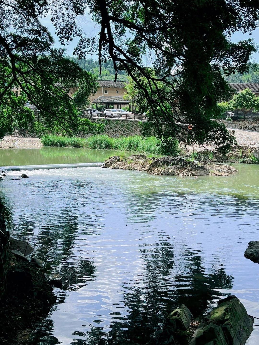 오래된 돌길(青石板路 Qīngshíbǎn lù), 백 년 된 고목(百年榕树 Bǎinián róngshù), 조용히 흐르는 시냇물(小溪 Xiǎoxī)이 어우러진 시적인 분위기.