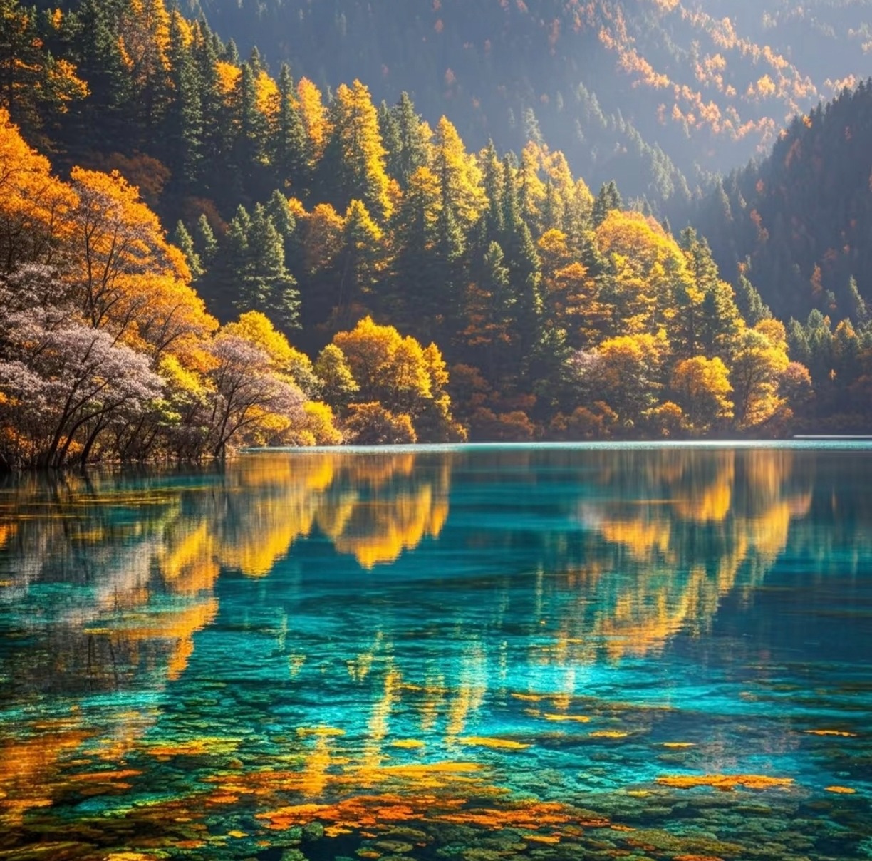 九寨沟的秋天,是一幅色彩斑斓的画卷。走进这片神奇的土地,仿佛进入了一个梦境。漫山遍野的树木披上了金黄色的外衣,红的如火,黄的似金,交织成一幅绚丽多彩的秋日图景。清澈见底的湖水倒映着天空的湛蓝和周围山峦的翠绿,微风吹过,水面荡起层层涟漪,犹如一面波光粼粼的镜子。