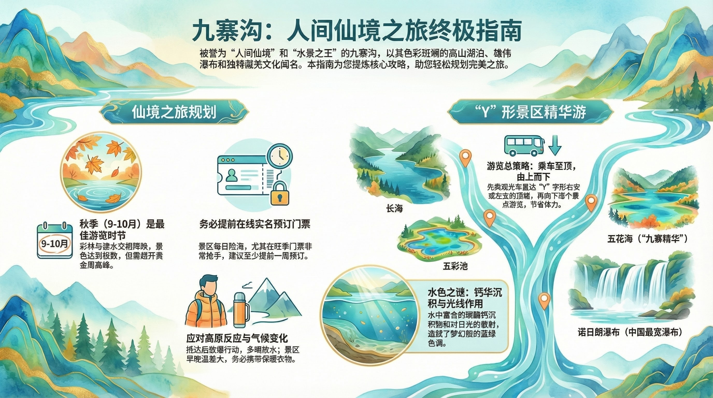 九寨沟的行程规划应考虑其“Y”字形地貌和观光车系统,以实现高效游览。