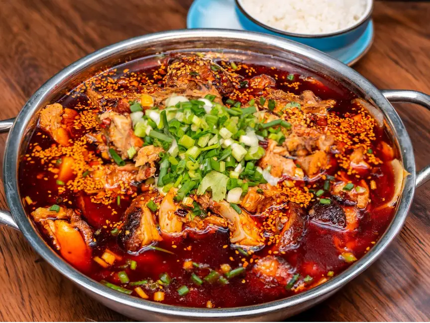 - 개념: 바삭하게 구운 오리를 잘라 매콤한 마오차이 국물에 담가 채소 등 다양한 재료와 함께 먹는 방식이다.