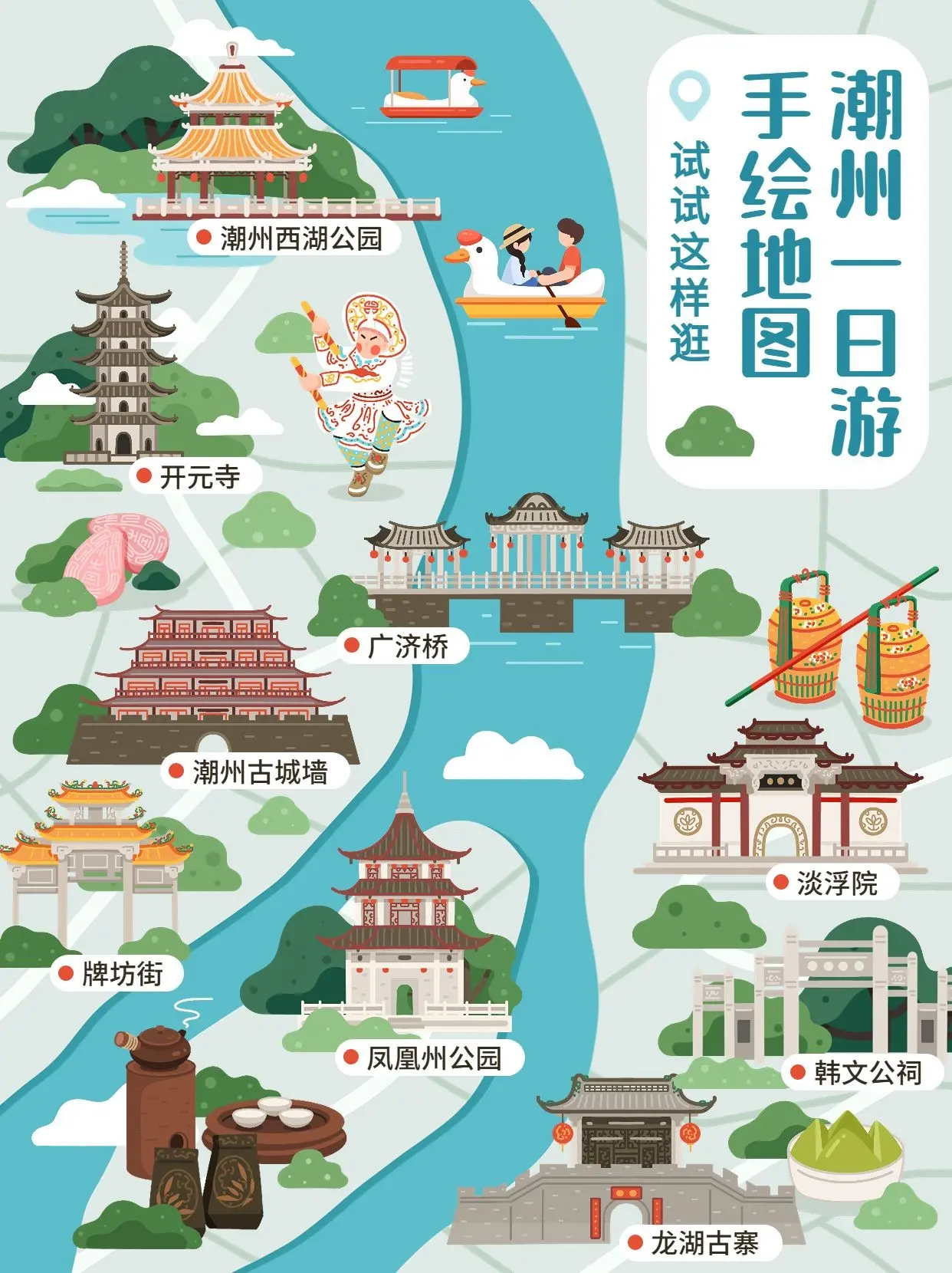 - 한문공사(韓文公祠): 당나라 시대 문학가이자 관리였던 한유(韓愈)를 기리기 위해 세운 사당이다. 한유는 차오저우로 좌천되었을 때 수리 시설 개선과 교육 진흥 등 지역 발전에 큰 공헌을 했으며, 이로 인해 지역민들의 깊은 존경을 받고 있다.