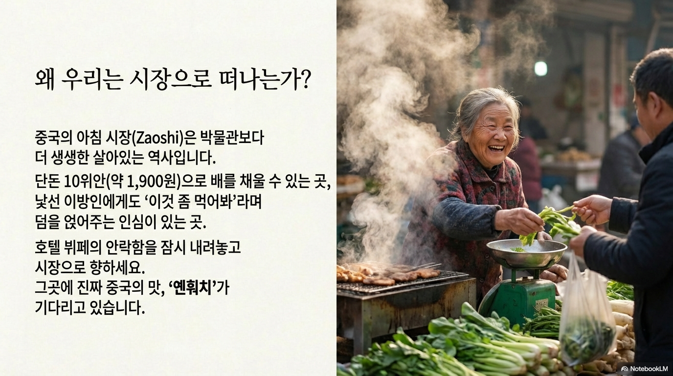 중국인의 하루는 아침 식사와 함께 시작되며, 이 한 끼 식사는 단순한 영양 섭취를 넘어 깊은 문화적 의미를 지닙니다. 특히 동네 곳곳에서 열리는 '아침 시장'은 현지인의 삶이 가장 생생하게 펼쳐지는 무대이자, 그 지역의 독특한 식문화를 응축해 놓은 보고(寶庫)와도 같습니다. 시장에 들어서는 순간 코끝을 자극하는 다채로운 음식 냄새, 상인들의 활기찬 외침, 분주하게 오가는 사람들의 모습이 어우러져 만들어내는 '연화기(烟火气, 사람 사는 냄새)'는 그 어떤 관광 명소보다 진솔한 중국의 얼굴을 보여줍니다.
