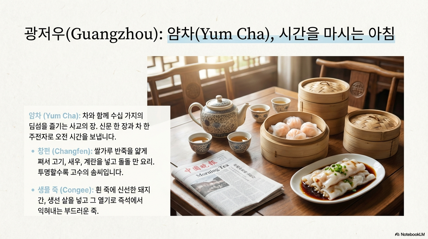 여유로운 사교 및 미식 경험 (광저우의 '자오차'처럼 맛과 대화를 즐기는 '의식') |