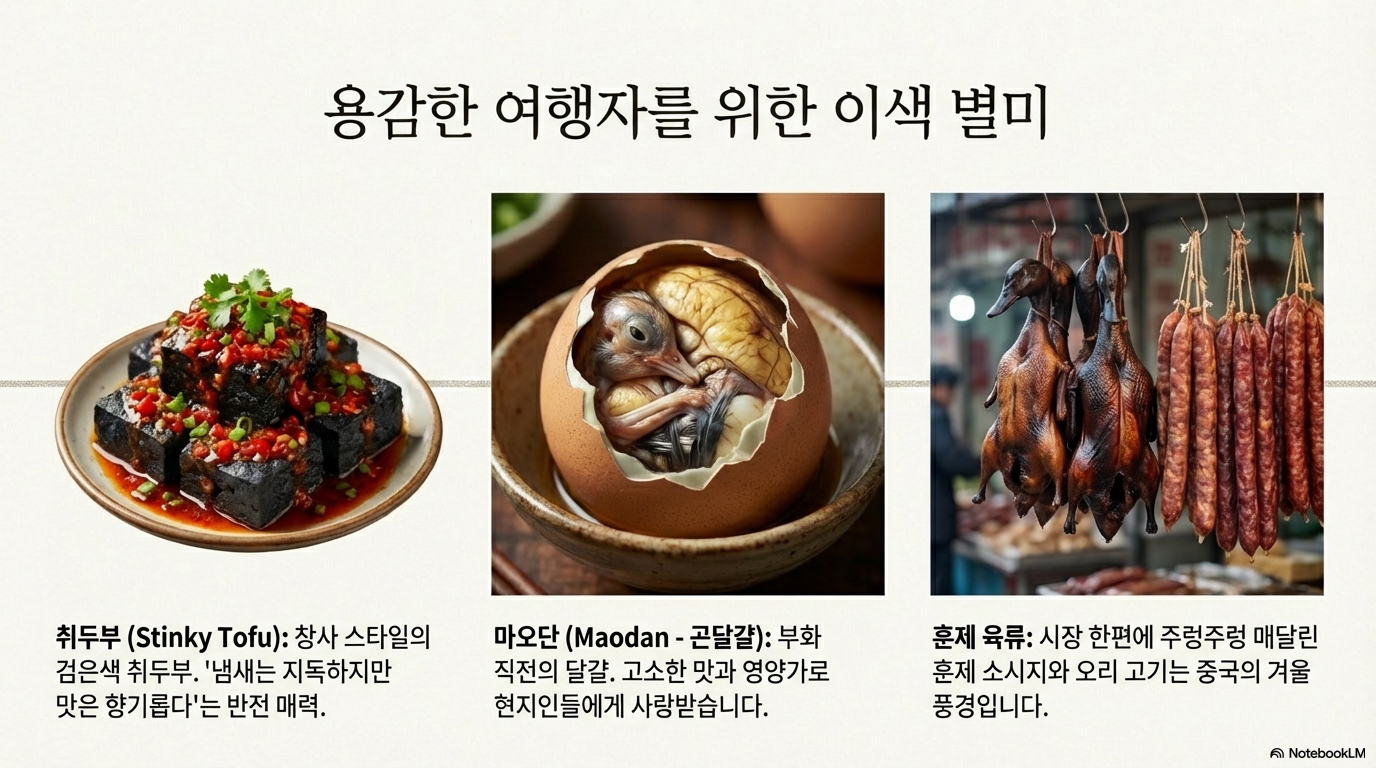 | 마오더우푸 | 毛豆腐 (Máodòufu) | 두부 표면에 흰 솜털 같은 곰팡이를 피워 발효시킨 음식. 튀기거나 구워 먹으며 독특한 풍미를 지닌다. |