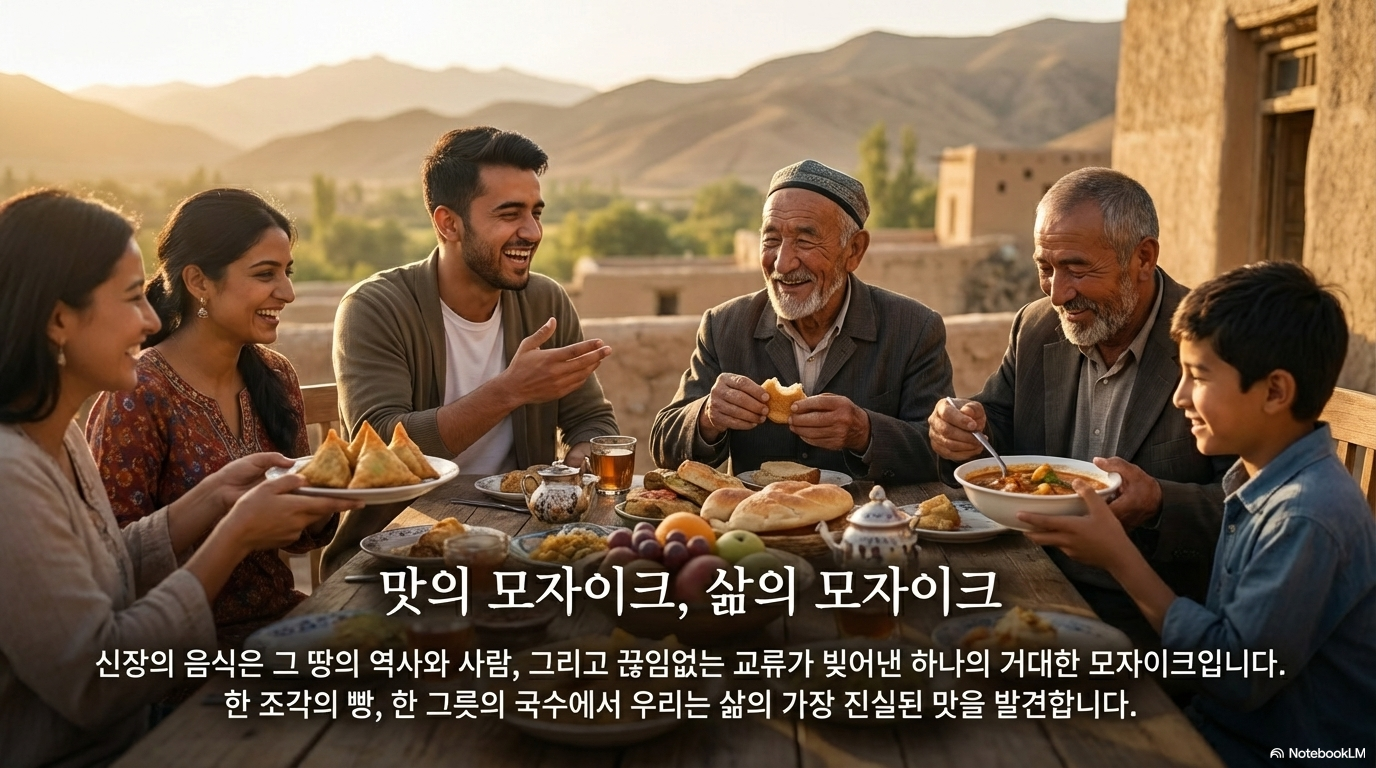 신장 사람들에게 음식은 단순히 생존을 위한 수단이 아니었다. 그것은 가족 간의 사랑을 확인하는 의식이자, 공동체의 유대를 다지는 축제이며, 자신들의 정체성을 표현하는 가장 진솔한 언어였다. 친구 쿠르반잔이 잃어버렸다고 말한 ‘귀속감’은 어쩌면 거창한 것이 아니라, 어머니가 만들어준 좌판 한 그릇과 같은 일상의 맛에 뿌리내리고 있는 것일지도 모른다.