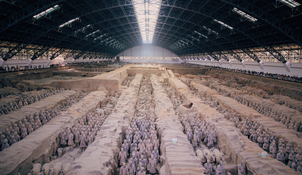 진시황릉의 배장갱에서 출토된, 병사와 말을 흙으로 빚어 구운 인형. 진나라 군대의 편제, 무기, 모습을 사실적으로 재현하여 '세계 8대 불가사의'로 불린다.
