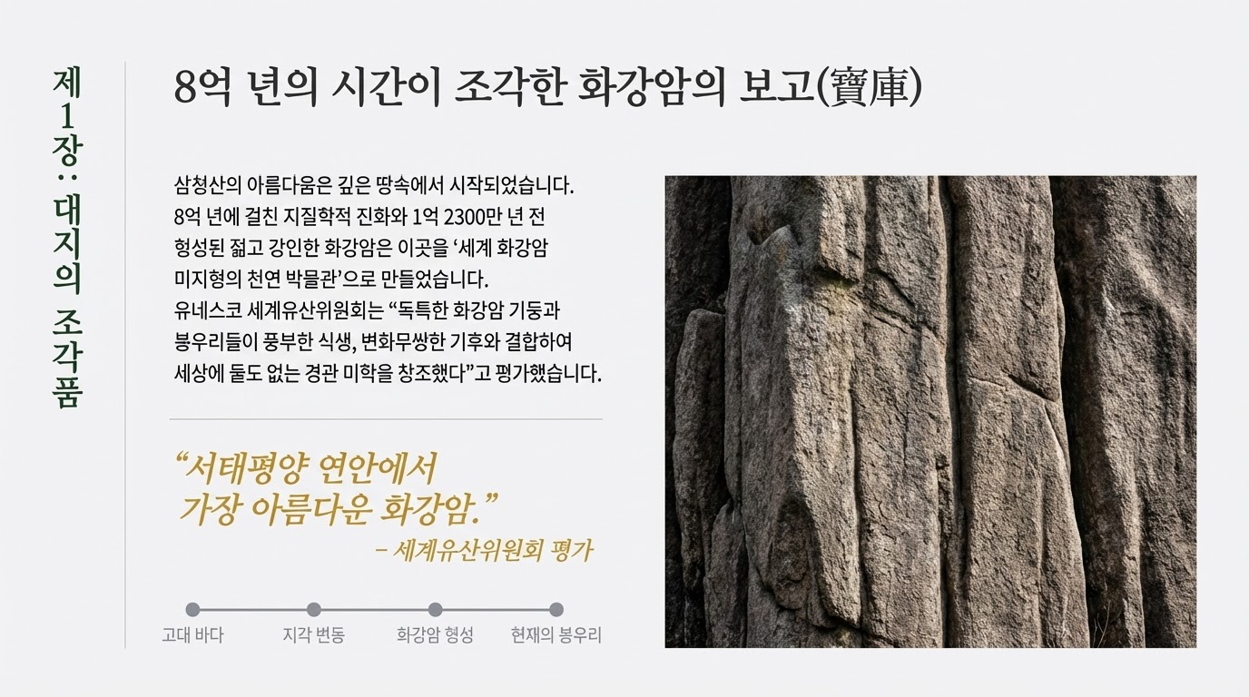 삼청산의 뾰족하고 날카로운 화강암 봉우리들을 마주하면, 우리는 수십억 년의 시간을 이겨낸 태고의 지혜를 떠올립니다. 하지만 놀랍게도, 그 장엄한 모습 뒤에 숨겨진 진실은 정반대입니다. 삼청산의 아름다움은 나이 듦이 아닌, 지질학적 '젊음'에서 비롯됩니다.
