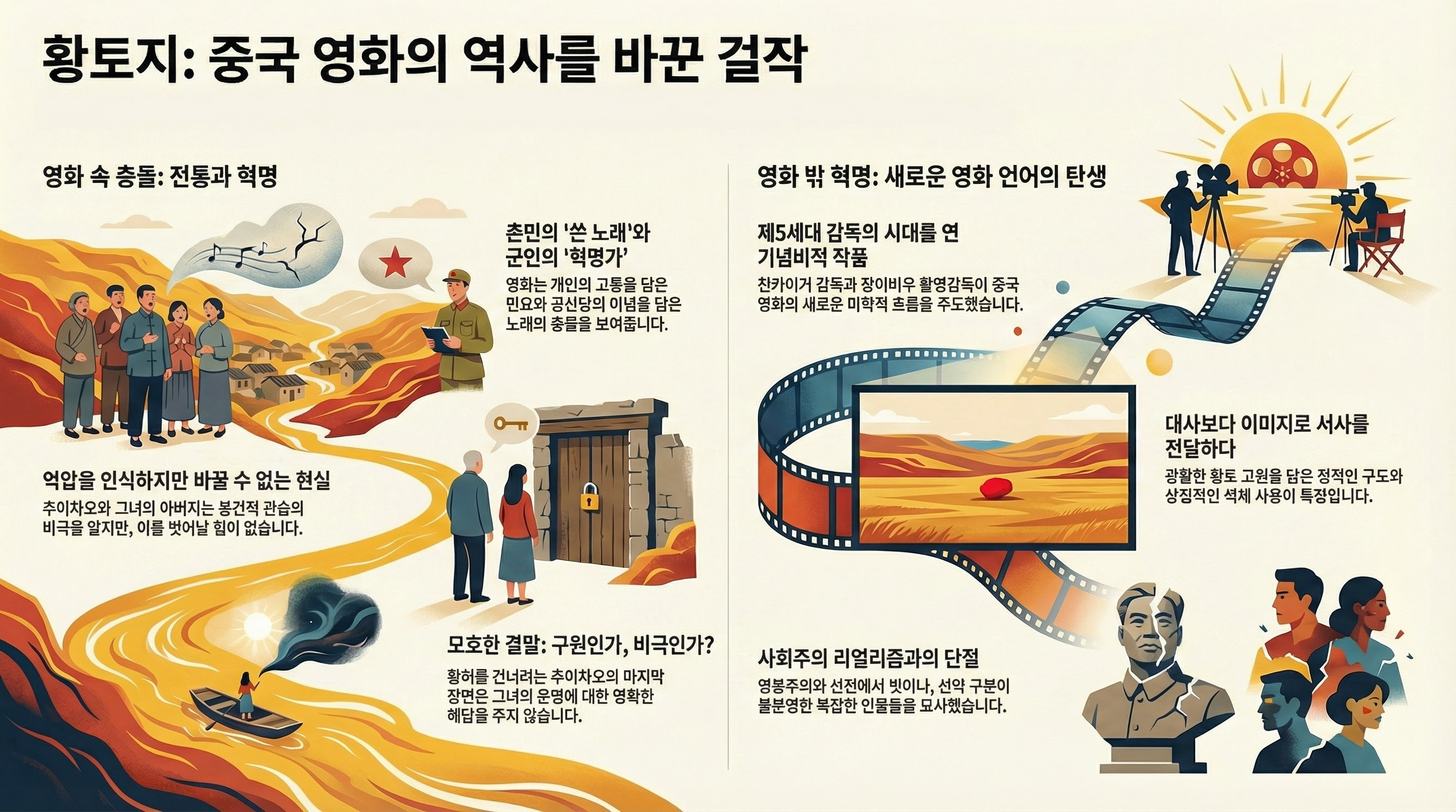 1984년에 개봉한 영화 <황토지>는 천카이거(陈凯歌) 감독의 데뷔작이자 촬영감독 장이머우(张艺谋)와의 유일한 협력 작품으로, 중국 영화사에서 '5세대 감독'의 등장을 알린 기념비적인 작품이다. 영화는 마오쩌둥 시대 혁명 이데올로기의 이상과 그것이 중국 농촌의 뿌리 깊은 봉건적 현실과 충돌하며 겪는 한계를 비판적으로 성찰하는 동시에, 그 이상이 불러일으켰던 유토피아적 열망을 담아낸다.