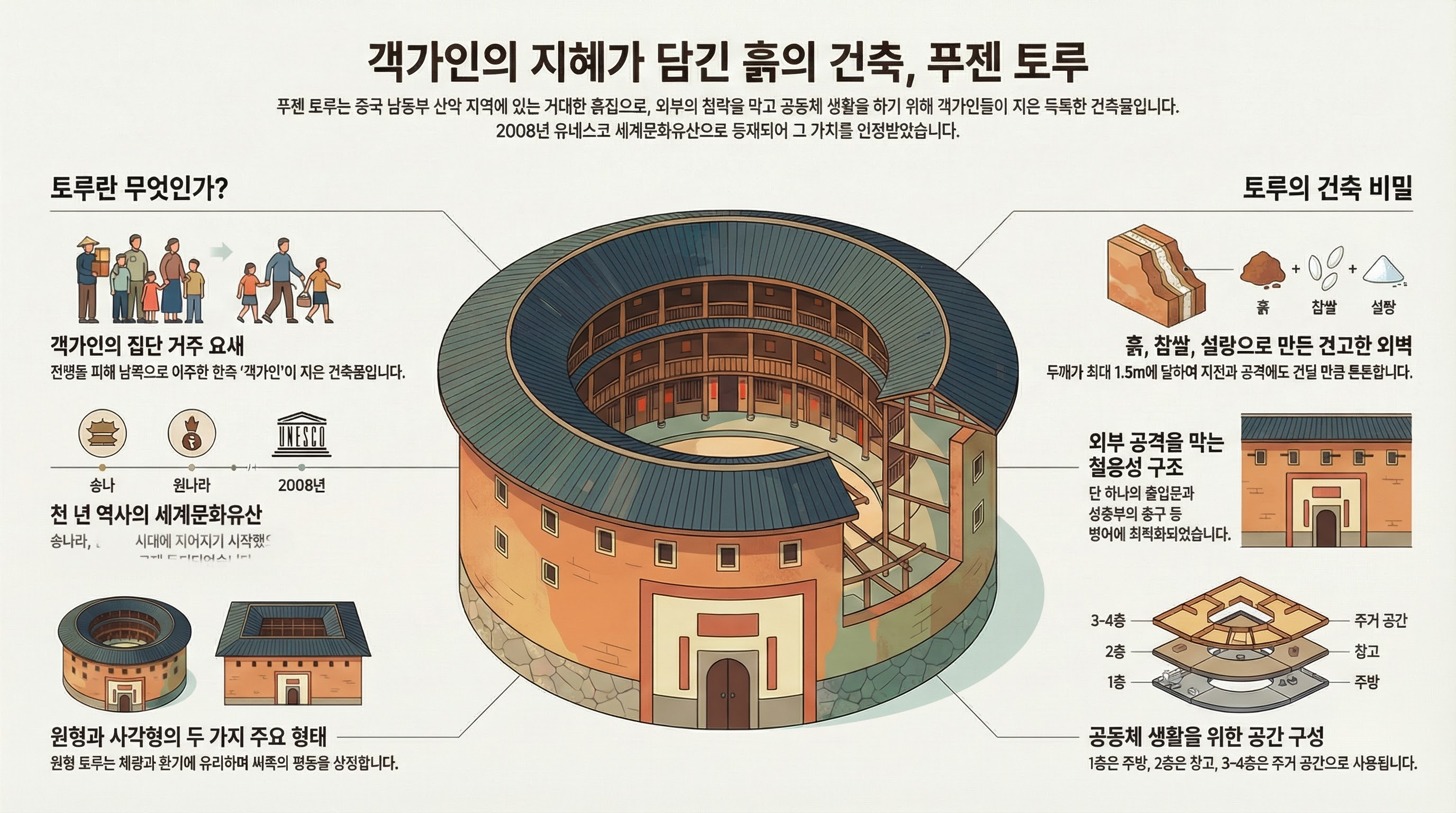 푸젠성의 산간 지역을 여행하다 보면, 마치 거대한 우주선이 내려앉은 듯한 비현실적인 건축물을 마주하게 됩니다. 이것이 바로 객가인의 지혜와 생존의 역사가 담긴 토루(土楼)입니다. 단순히 흙으로 지은 집이 아니라, 낯선 땅에서 씨족 공동체의 생존을 책임졌던 난공불락의 요새이자 삶의 터전이었습니다.