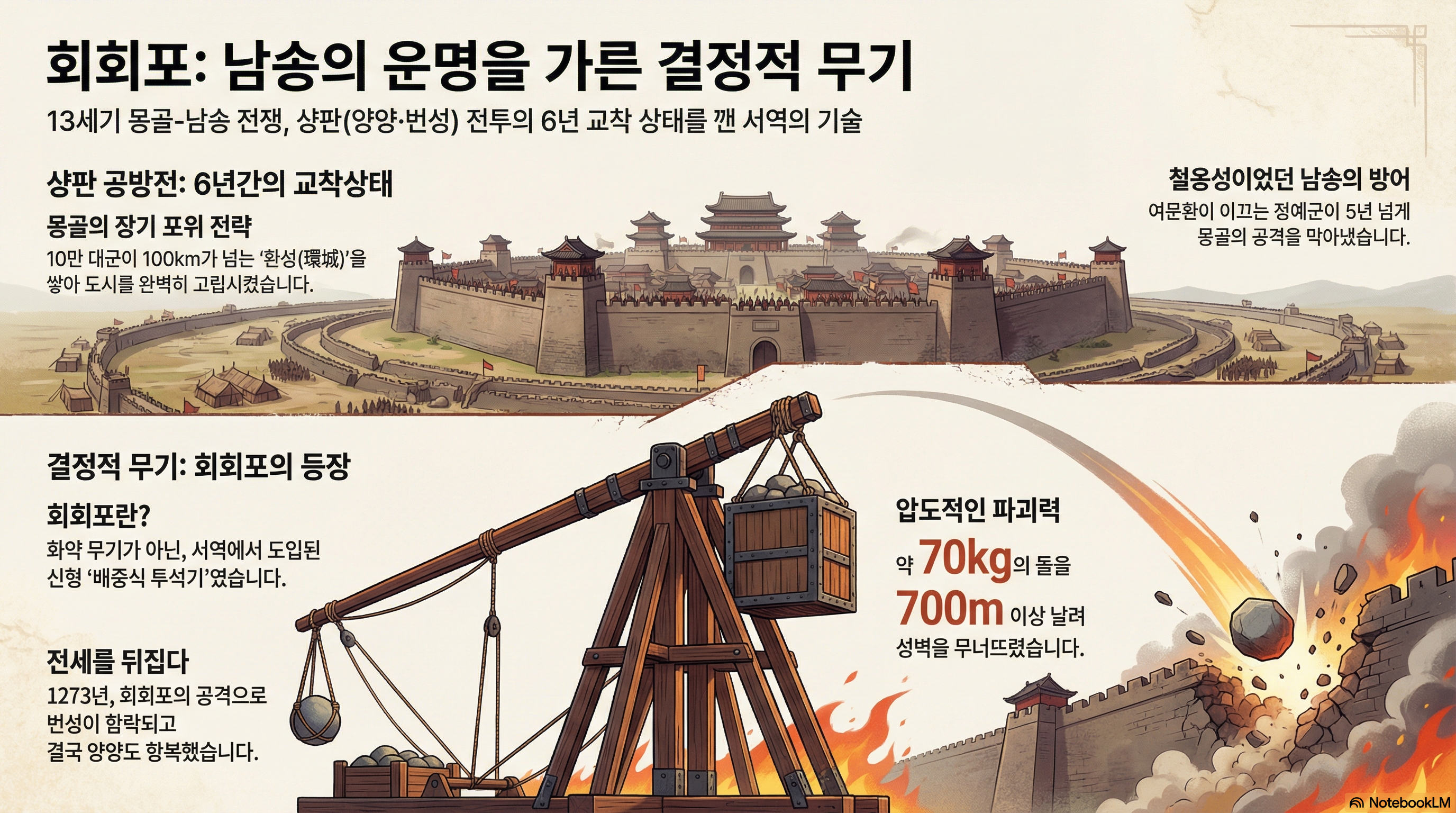 전투의 승패를 가른 결정적 요인은 서아시아에서 도입된 신무기 '회회포(回回砲)'였습니다. 이 배중식(配重式) 투석기는 기존의 인력식 투석기를 압도하는 파괴력으로 견고했던 번성과 양양의 성벽을 파괴하며 몽골의 승리를 확정 지었습니다.