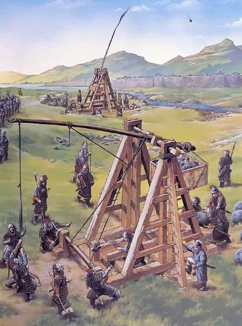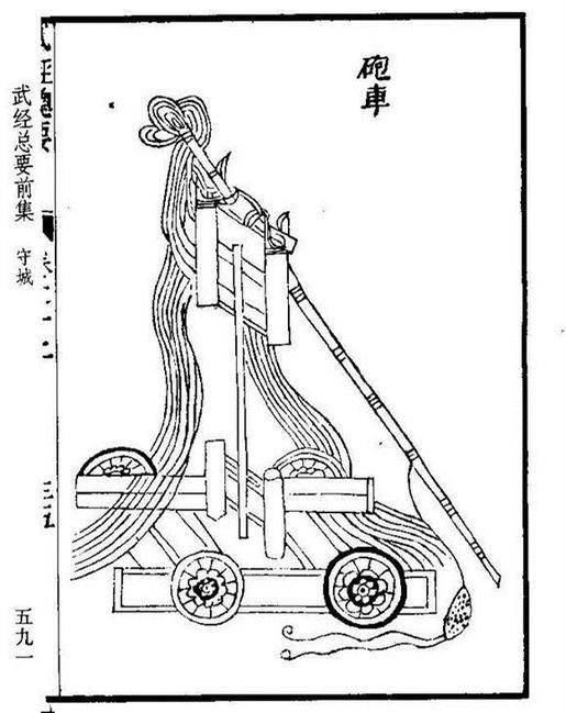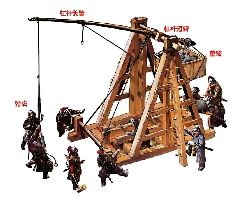 - 작동 원리: 인력으로 밧줄을 당겨 발사하는 기존의 '예색식(拽索式)' 투석기와 달리, 거대한 평형추(配重)의 무게를 이용해 포탄을 발사하는 '배중식(配重式)' 투석기입니다.