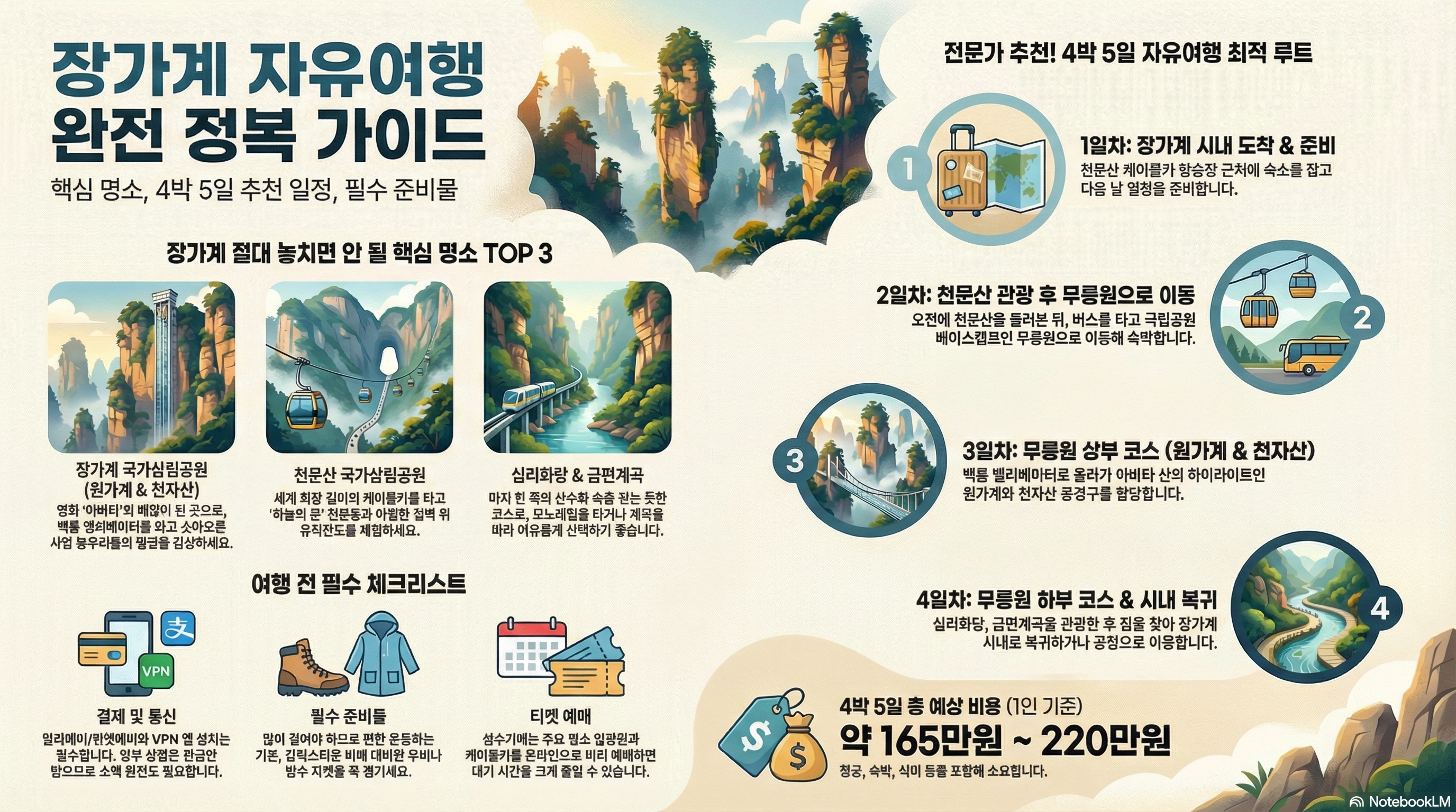 7. 자료에 따르면 4박 5일 장가계 여행의 1인당 총 예상 비용은 어느 정도이며, 이 비용에 포함되는 주요 항목은 무엇인가? 4박 5일 장가계 여행의 총 예상 비용은 중간 수준의 여행 스타일을 기준으로 1인당 약 165만 원에서 220만 원 사이입니다. 이 비용에는 항공권, 숙박비, 현지 교통비, 주요 관광지 입장료, 식비 및 기타 경비(기념품, 간식 등)가 모두 포함되어 있습니다.