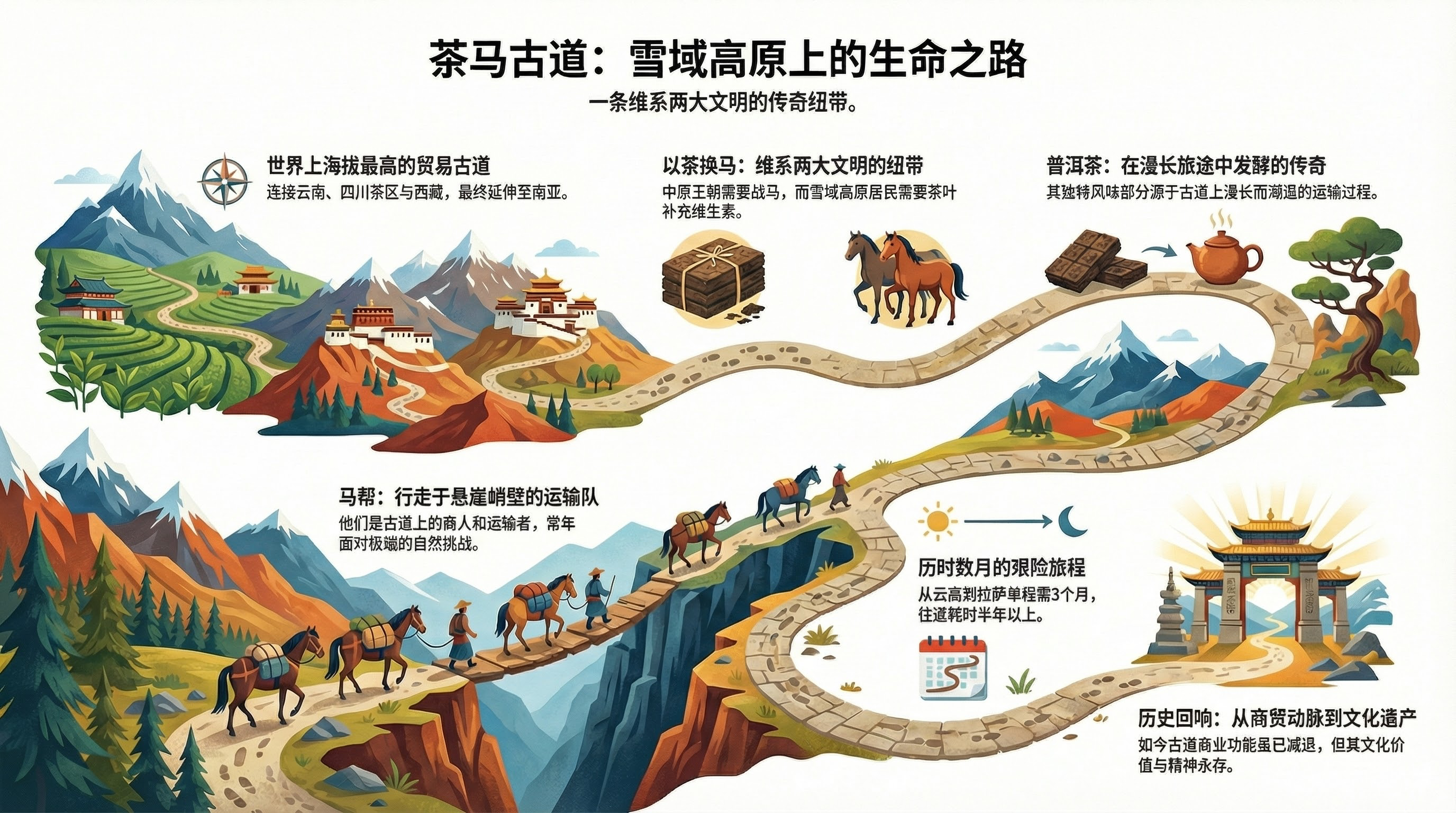 - 차마호시(茶馬互市): 가장 직접적인 형성 배경은 당·송 시대부터 시작된 공식적인 차-말 교역입니다. 육류와 유제품 위주의 식생활을 하던 티베트 고원 민족에게 차는 비타민 보충과 소화를 돕는 필수품이었습니다. 티베트 속담에 "차라리 하루 굶을지언정, 차 없이는 하루도 살 수 없다(宁可一日无食,不可一日无茶)"라는 말이 있을 정도로 차의 중요성은 절대적이었습니다. 반면, 중원 왕조는 북방 민족과의 전쟁에 필수적인 군마를 안정적으로 확보하기 위해 티베트의 말을 필요로 했습니다. 이러한 상호 필요에 의해 송나라 때는 전문 관리 기구인 '차마사(茶馬司)'를 설치하여 교역을 제도화했습니다.