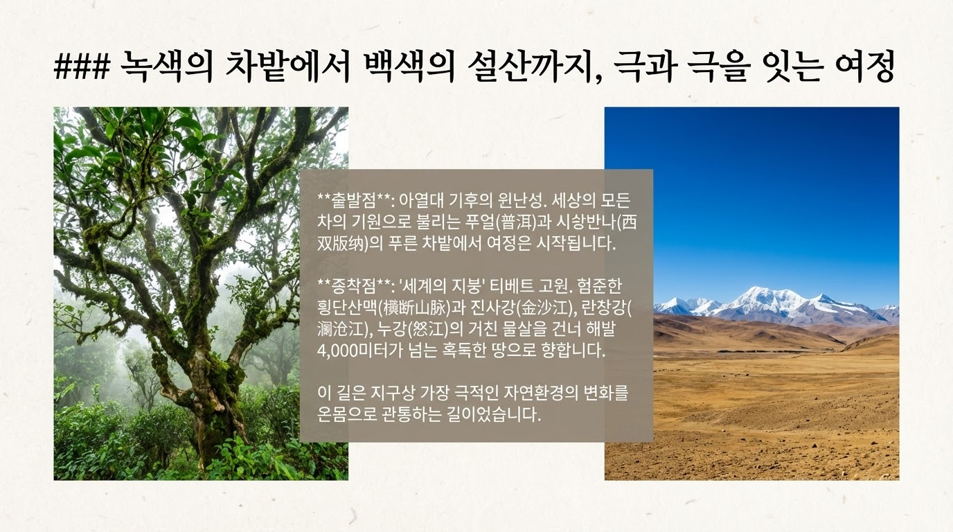 쓰촨성 야안(雅安) | 캉딩(康定), 리탕(理塘), 바탕(巴塘), 망캉(芒康) | 북부 노선으로 불리며, 주로 쓰촨의 **벽돌차(边茶)**가 운송되었다. 특히 기점인 야안은 험한 산길에서 사람의 등으로 짐을 나르던 '배부(背夫)' 문화의 중심지였다. |