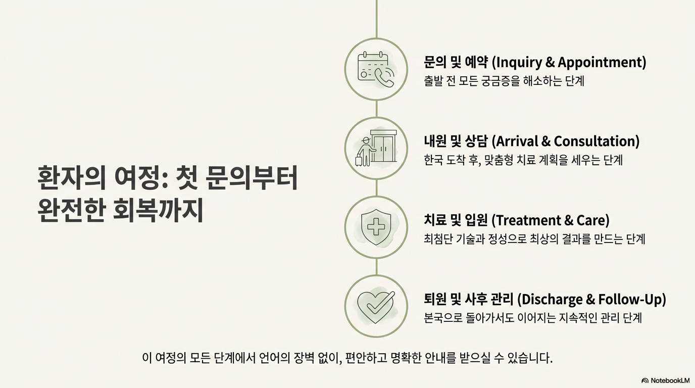 - 사전 문의 사항: 특정 의사 지정 가능 여부, 외래 진료 후 당일 입원 가능성, 입원 시 준비물, 중국 현지 의료 자료(MRI, CT, 소견서)의 필요성 등을 사전에 확인한다.