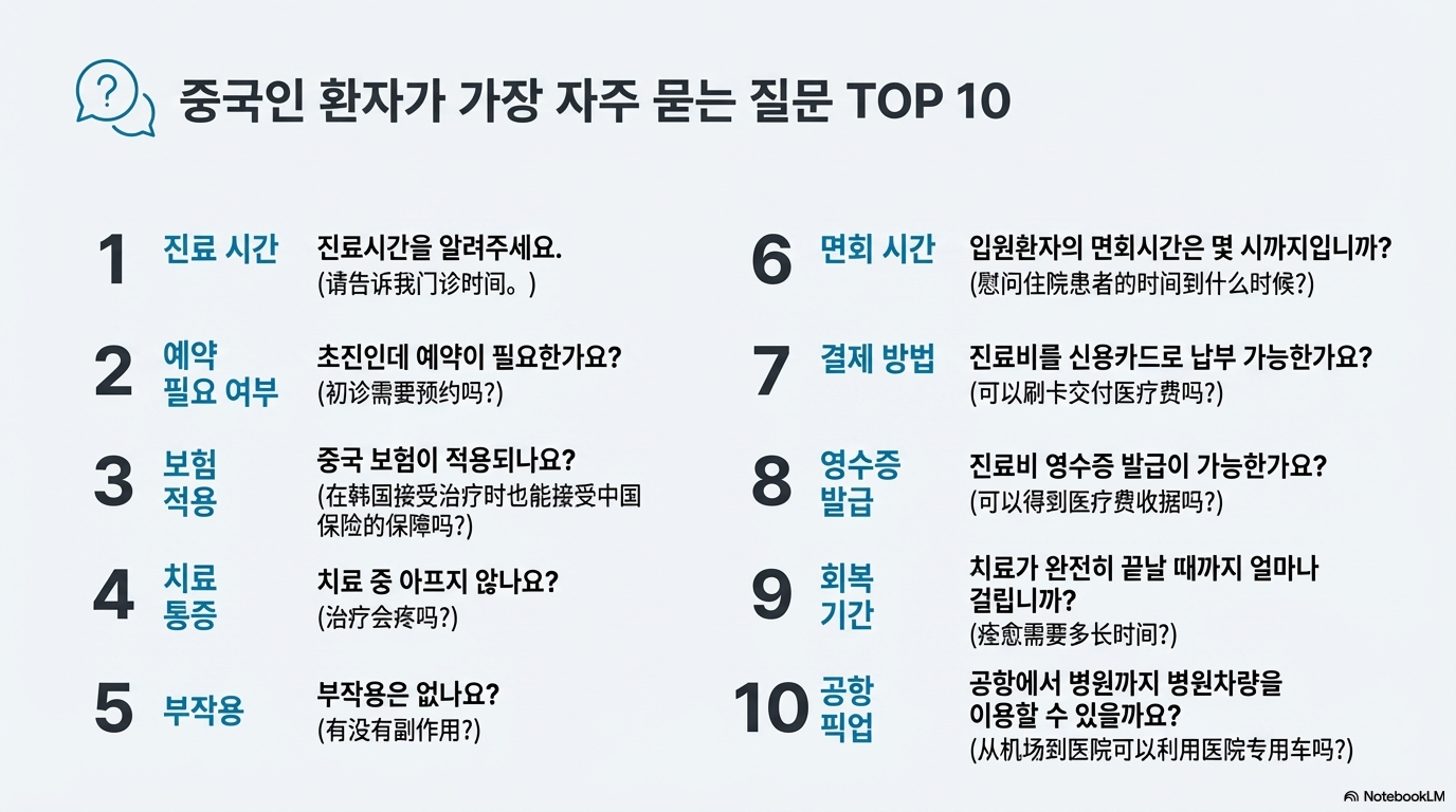 - 문화적 차이: "중국의 경우 보호자는 병원에 머물 수 없는데요. 한국 병원은 다르다고 들었습니다." 라는 환자의 질문에서 나타나듯, 한국의 보호자 동반 입원 문화는 중국 환자에게 생소한 부분이다.