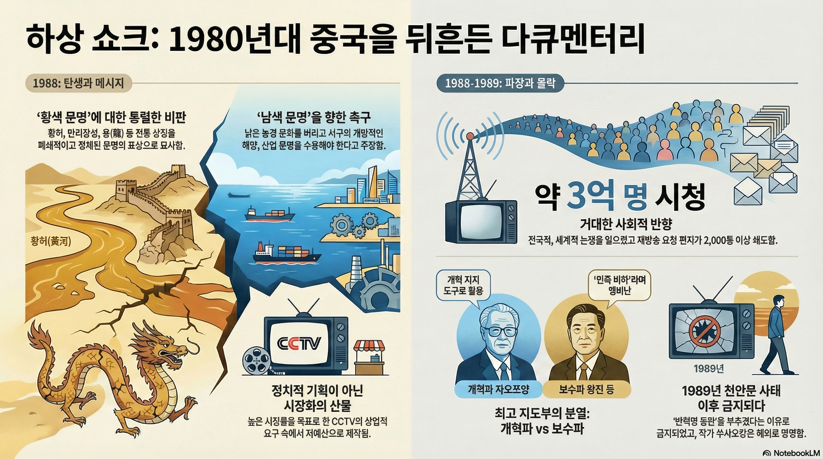 [진행자] 對,說不定我們可以從那個紀錄片《河殤》開始。片子裡有個畫面特別有象徵意味,你記得吧?就是那個黃河混黃的河水,代表著古老的中華文明,最後流進了藍色的大海。 (duì, shuōbudìng wǒmen kěyǐ cóng nàge jìlùpiàn "héshāng" kāishǐ. piànzi lǐ yǒu gè huàmiàn tèbié yǒu xiàngzhēng yìwèi, nǐ jìde ba? jiùshì nàge huánghé hùnhuáng de héshuǐ, dàibiǎozhe gǔlǎo de zhōnghuá wénmíng, zuìhòu liújìn le lánsè de dàhǎi.) 맞아요, 아마 다큐멘터리 《하상》부터 시작하면 좋겠네요. 영상 속에 아주 상징적인 장면이 하나 있는데 기억하시나요? 황하의 누런 흙탕물이 고대 중화 문명을 상징하며 흘러가다 결국 푸른 바다로 들어가는 장면 말이죠.