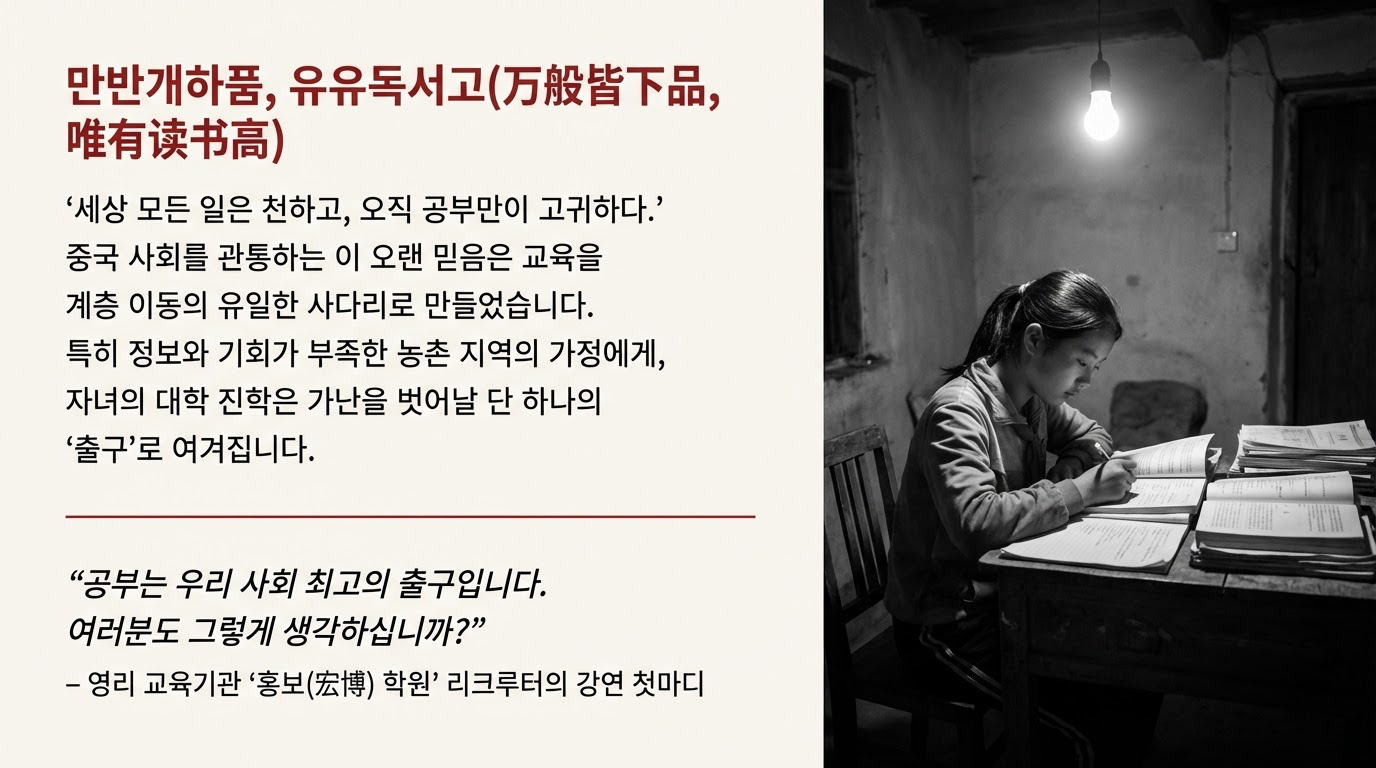 중국 사회에서 교육은 빈곤을 탈출하고 더 나은 삶을 성취할 수 있는 가장 확실한 '출구'로 여겨진다. 그러나 다큐멘터리는 이 믿음이 어떻게 현실과 충돌하는지를 보여준다.