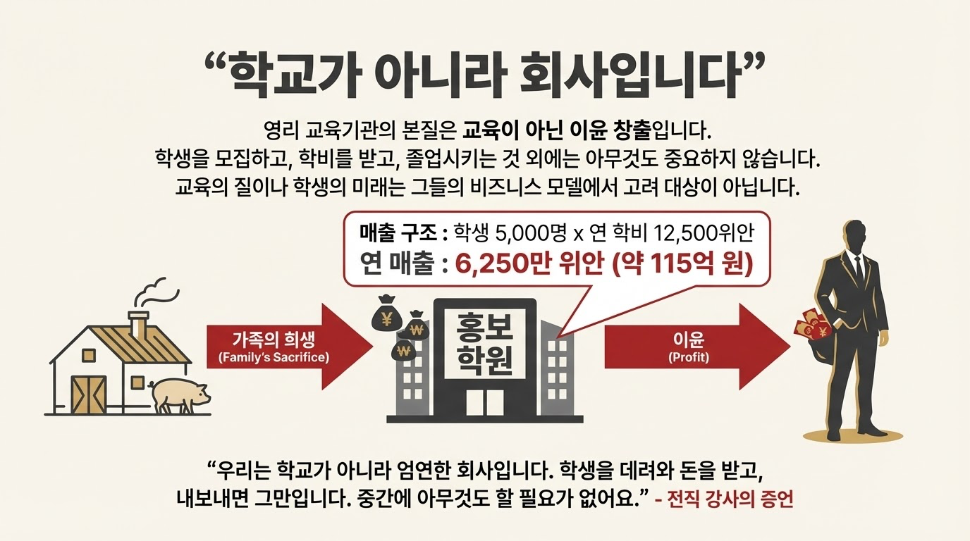 이들의 유일한 목표는 학생을 유치하여 이윤을 극대화하는 것이며, 교육의 질이나 학생의 미래는 고려 대상이 아니다.
