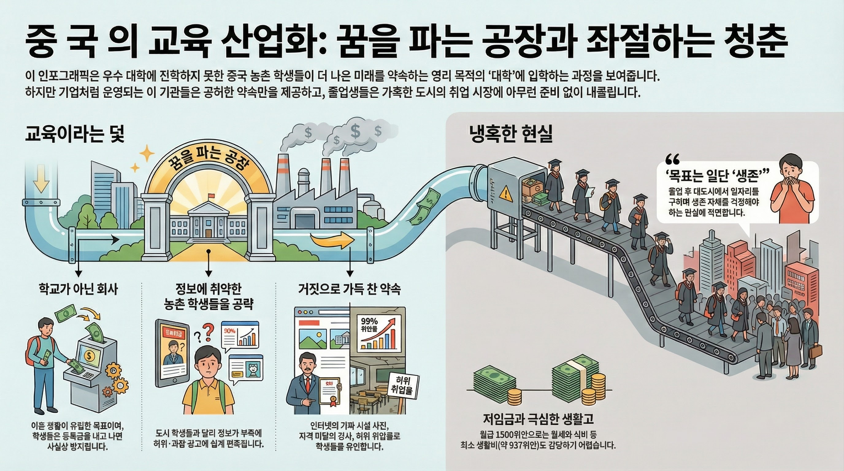 교육이 제시하는 숭고한 약속의 이면에는 그것을 이윤 창출의 기회로 삼는 냉혹한 비즈니스 논리가 작동하고 있다. 이 시스템 안에서 교육은 더 이상 신성한 가치를 지닌 활동이 아니라, 철저히 계산된 이익을 목표로 하는 '산업'으로 전락한다. 교육 기관은 학생을 지적 탐구의 동반자가 아닌 ‘고객’으로, 졸업장을 인간 성장의 증표가 아닌 ‘상품’으로 취급하며 거대한 환멸의 공장을 가동한다.