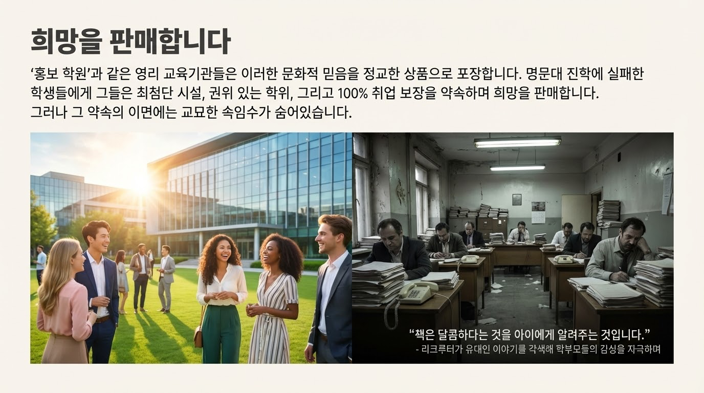 이처럼 교육이 제시하는 이상향은 개인의 정신적 성장부터 가족의 생계까지, 삶의 모든 영역을 아우르는 강력한 약속이다. 그러나 이 숭고한 약속들이 상업적 논리에 의해 잠식될 때, 희망의 땅은 어떻게 환멸의 공장으로 변모해 가는지 우리는 목도해야 한다.