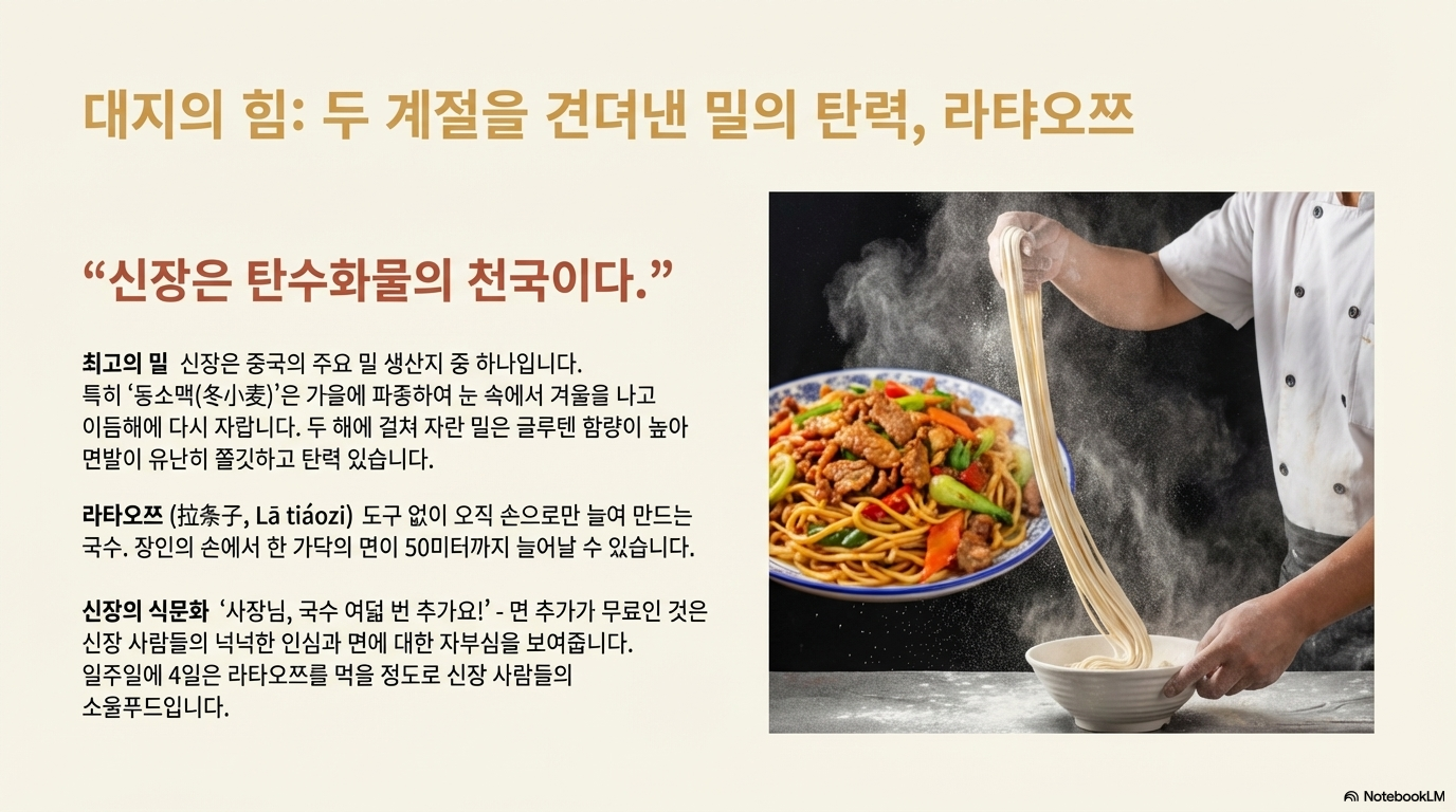 - 신장의 밀과 "탄수화물 천국(碳水天堂)": 일조량이 길고 생육 기간이 긴 신장의 겨울밀(冬小麥)은 품질이 매우 뛰어나 쫄깃한 식감(勁道)의 국수 요리 '라탸오쯔(拉條子)'를 탄생시켰다.