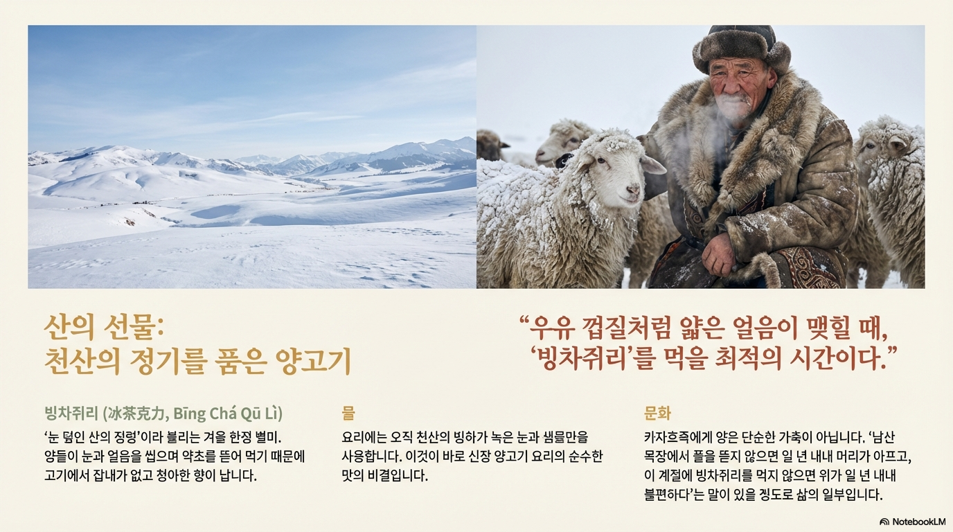 - '빙차쥐리'는 우루무치(烏魯木齊)의 겨울 한정 별미로, 눈 덮인 산에서 자라는 산양(쥐리) 요리입니다. 양들이 얼음(빙)이 섞인 풀을 뜯고 얼음이 녹은 물(차)을 마시기 때문에 '빙차쥐리'라는 이름이 붙었으며, 톈산(天山)의 빙하수와 눈 녹은 물로 끓여야 가장 신선한 맛을 냅니다.