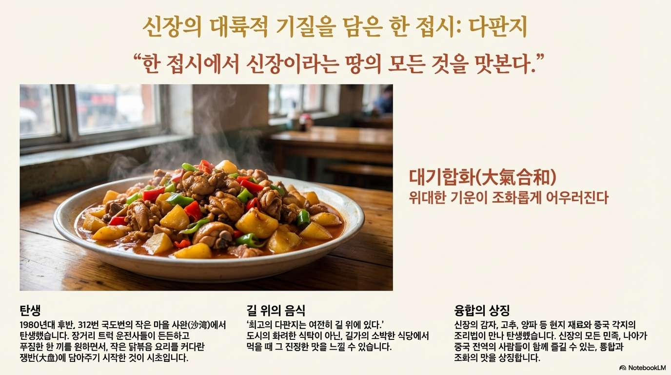 | 사완 다판지 (沙灣大盤雞) | 닭고기, 감자, 고추 등을 큰 접시에 푸짐하게 담아내는 요리. 닭고기를 40여 조각으로 정확히 자르고, 전분을 입혀 맛을 가두는 것이 특징. 식초(80g)를 뜨거운 솥 가장자리에 부어 향을 입히는 과정이 핵심. | 1988년 사완현에서 국도변 식당 주인이 장거리 트럭 운전사들을 위해 개발. 푸짐함과 조화로운 맛으로 전국적인 명성을 얻음. "길 위의 음식(路邊菜)"으로, 신장의 대범한 기질과 환대 문화를 상징. |