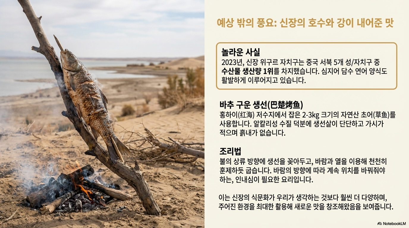 이는 사막과 건조한 기후라는 고정관념을 완전히 뒤엎는 사실입니다. 더욱 놀라운 것은, 최근 신장에서는 민물 연어 양식까지 성공적으로 이루어지고 있다는 점입니다. 세상에, 정말 상상조차 하기 힘든 일입니다. 이는 우리가 가진 지리적, 미식적 상식을 뛰어넘는 신장의 또 다른 매력을 보여줍니다.