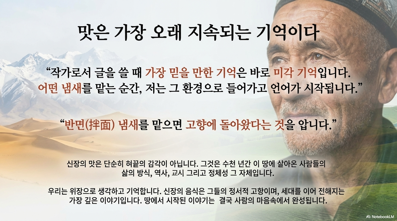 신장 사람들에게 음식은 생존 수단을 넘어, 고향에 대한 기억, 정체성, 그리고 공동체의 유대를 확인하는 중요한 문화적 장치이다.