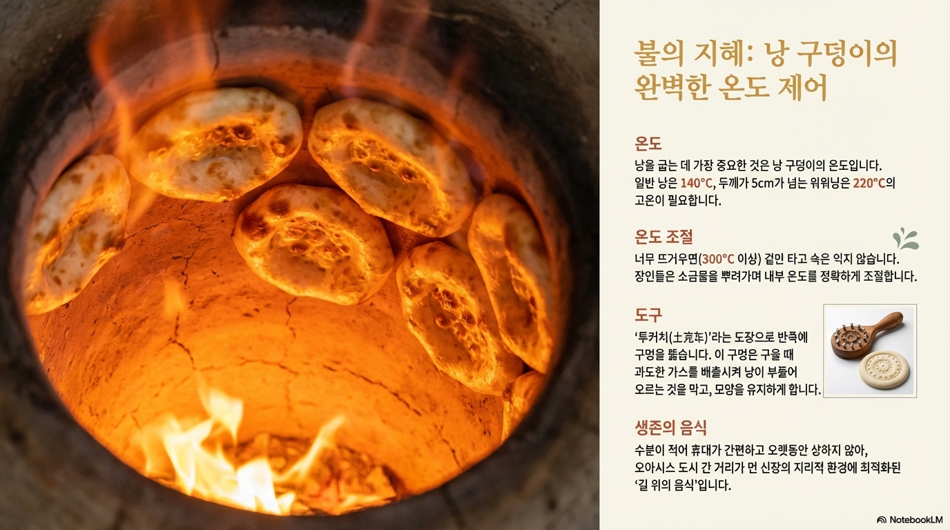 - '난컹'의 온도는 '워워낭'의 맛을 결정하는 핵심 요소입니다. 온도가 너무 높으면 겉만 타고 속은 익지 않으며, 너무 낮으면 바삭하고 부드러운 식감을 잃게 됩니다. 때문에 숙련된 장인은 소금물을 뿌려가며 5cm 두께의 워워낭에 가장 적합한 220°C의 고온을 유지합니다.