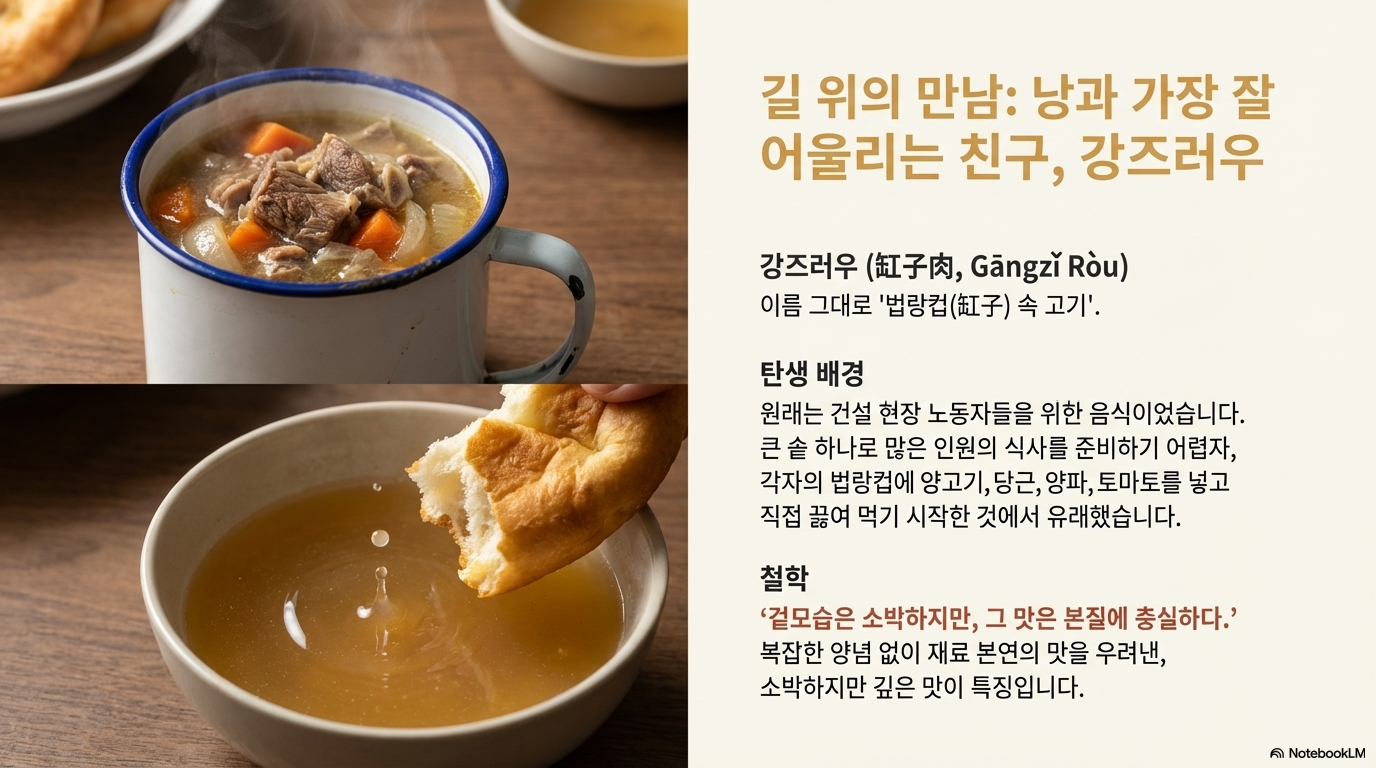 - '강쯔러우'는 원래 신장에서 수리 공사를 하던 노동자들을 위해 개발된 음식입니다. 큰 솥 하나로 끓이면 양고기가 불균일하게 익고 양을 나누기 어려워, 노동자들이 물 마시던 법랑컵(강쯔)에 양고기를 한 사람분씩 넣어 직접 끓여준 것에서 유래했습니다. 이 방식이 오히려 고기 맛을 더 향기롭게 만들어 현지 별미로 자리 잡았습니다.