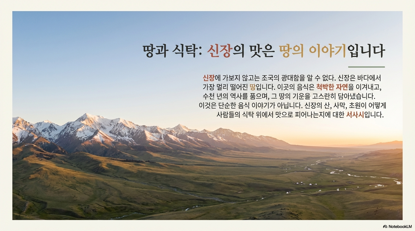 '신장(新疆) 요리' 하면 무엇이 떠오르시나요? 아마도 대부분은 지글지글 구워낸 양꼬치와 화덕에서 갓 꺼낸 둥근 빵, 낭(馕)을 떠올릴 것입니다. 하지만 이 유명한 음식들 뒤에는 척박한 환경에 적응하고, 여러 문화가 뒤섞이며 탄생한 혁신과 융합의 놀라운 이야기들이 숨어 있습니다. 이 글은 현지의 깊이 있는 통찰을 바탕으로, 우리가 몰랐던 신장 음식 문화의 가장 흥미롭고 의외의 진실들을 소개하고자 합니다.