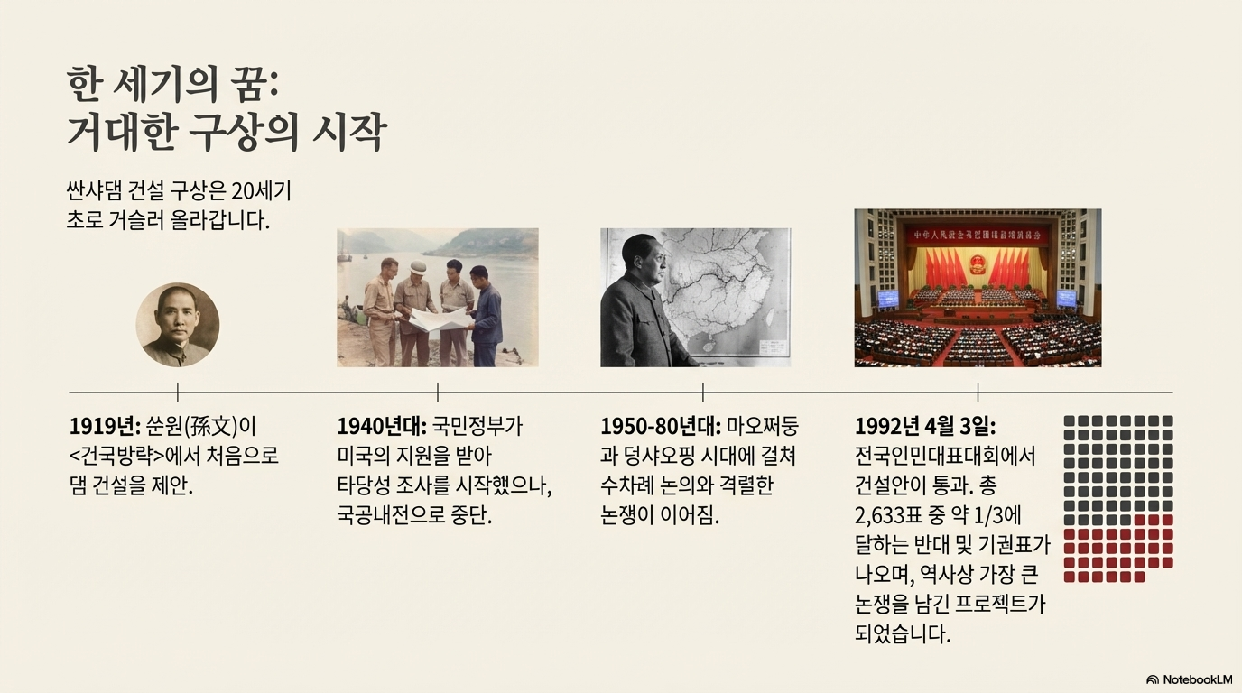 장강에 거대한 댐을 건설하자는 구상은 무려 100년 전으로 거슬러 올라갑니다. 1919년, '중국의 국부' 쑨원(Sun Yat-sen)이 처음으로 그 가능성을 제시한 이래, 이 프로젝트는 여러 지도자를 거치며 중국의 오랜 숙원 사업으로 남았습니다. 약 한 세기에 걸친 꿈이 마침내 현실이 된 것이죠.