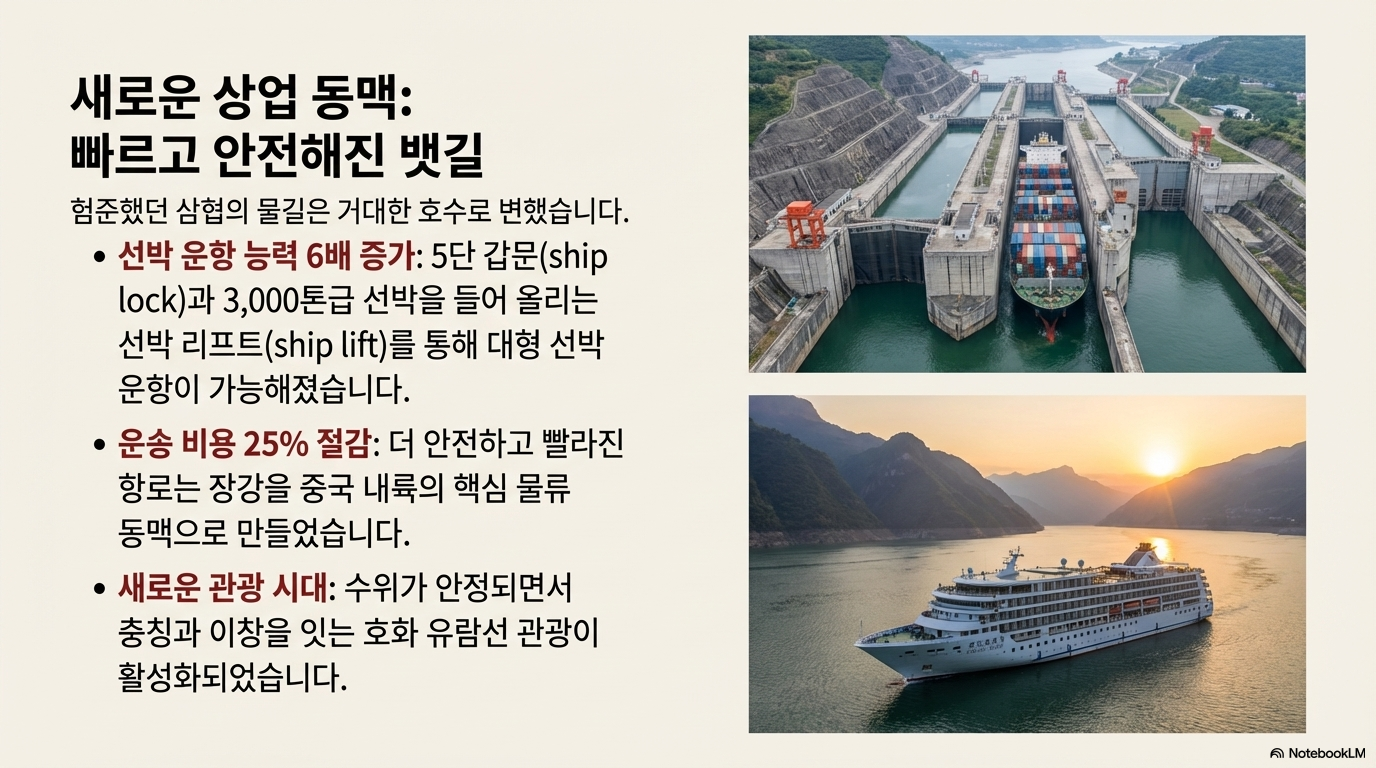 - 항해 개선: 댐 건설로 수위가 100m 이상 상승하면서 위험했던 급류와 암초가 물에 잠겼습니다. 이를 통해 1만 톤급 대형 선박이 내륙 깊숙한 충칭까지 안전하게 항해할 수 있게 되어 장강은 명실상부한 '황금 수로'로 변모했습니다.