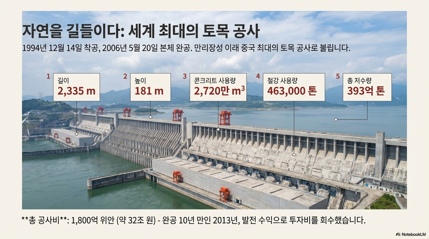 | 사용 자재 | 콘크리트 2,720만 m³, 강철 46.3만 톤 |