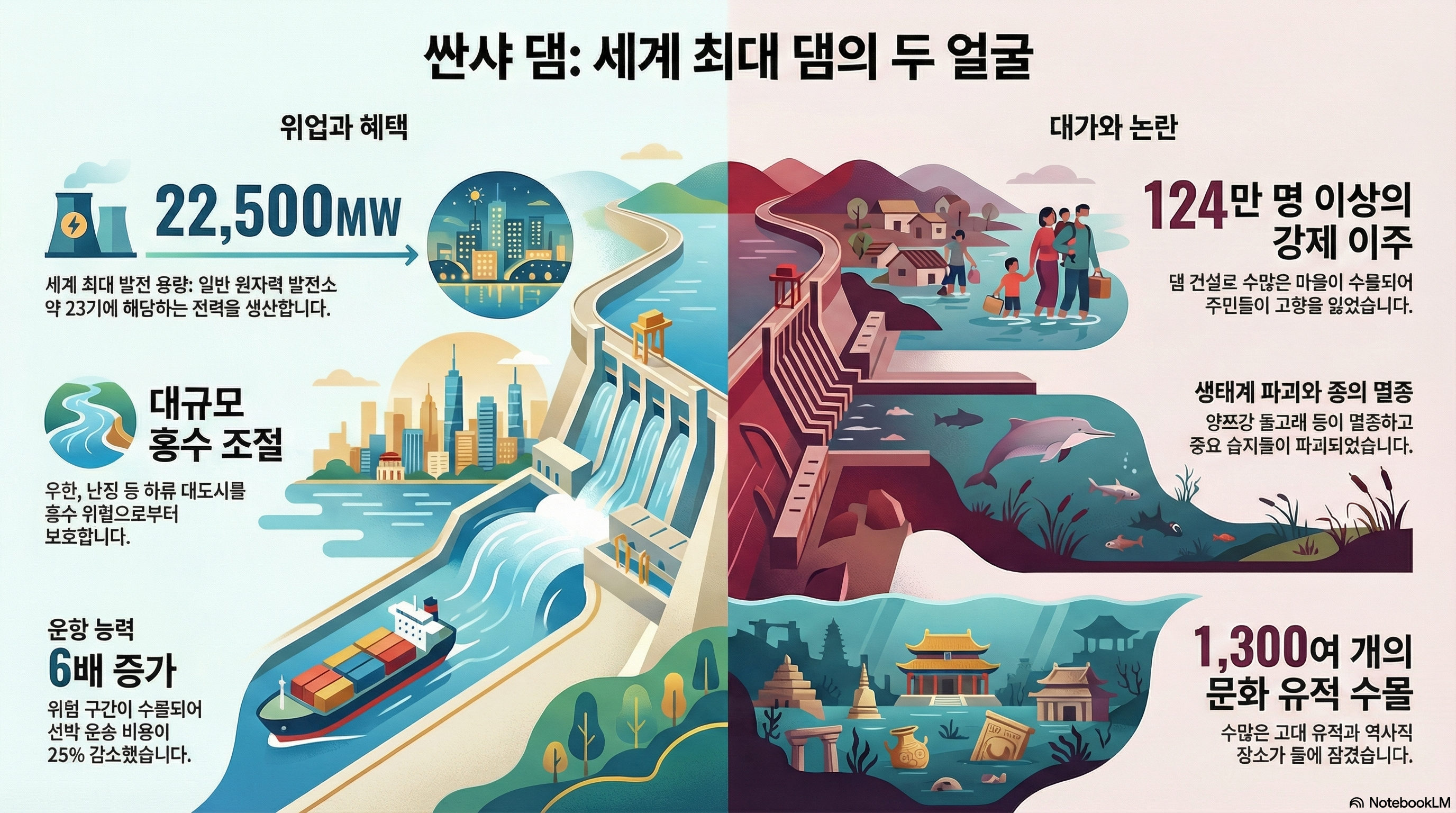 싼샤댐은 홍수 조절, 전력 생산, 내륙 운송의 혁신을 이뤄낸 인류의 위대한 기술적 성취입니다. 하지만 동시에 지구의 자전에 영향을 미치고, 생태계를 교란하며, 수많은 사람의 삶의 터전과 값을 매길 수 없는 문화유산을 물속에 잠기게 했습니다.