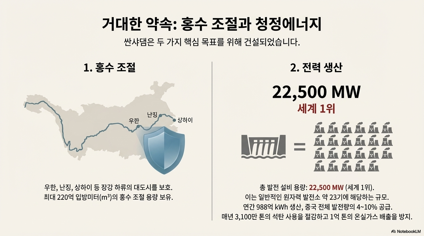 주요 편익으로는 막대한 양의 청정에너지 생산, 우한, 난징, 상하이 등 하류 대도시의 홍수 피해 방지, 그리고 대형 선박이 충칭까지 운항할 수 있는 '황금 수로'의 개척이 꼽힙니다.