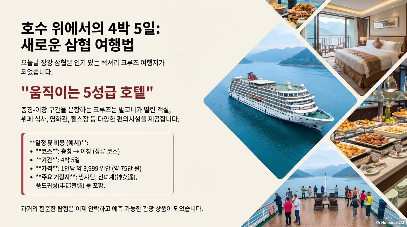 댐 완공 이후 장강은 새로운 관광 명소로 탈바꿈했습니다. 충칭에서 이창까지 운항하는 럭셔리 크루즈는 국내외 관광객들에게 큰 인기를 끌고 있습니다. 관광객들은 유람선을 타고 변화된 삼협의 풍경을 감상하고, 백제성, 풍도귀성, 신녀계 등 주요 명소를 방문하는 기항지 투어를 즐깁니다.