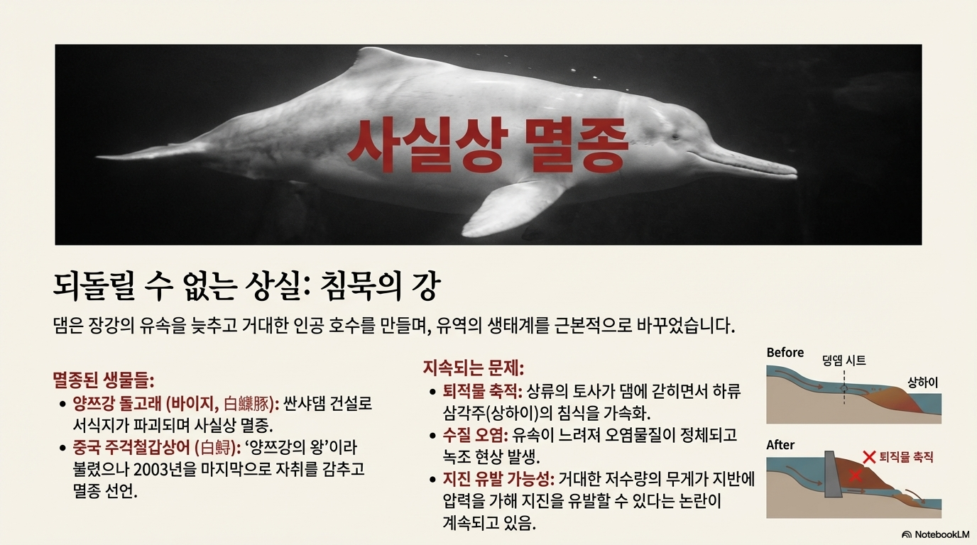 - 생물다양성 손실: 댐이 양쯔강돌고래(바이지)와 중국주걱철갑상어의 멸종에 결정적인 원인을 제공한 것으로 지목됩니다. 또한, 철갑상어, 양쯔강악어 등 여러 멸종위기종의 서식지를 파괴했으며, 시베리아흰두루미의 월동지로 유입되는 물을 차단해 생태계를 위협했습니다.