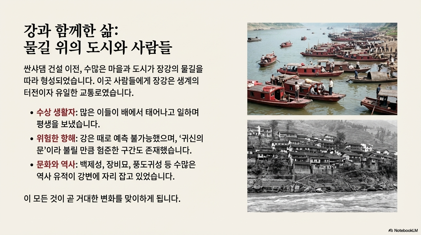 과거 이백이 "가벼운 배는 이미 만 겹의 산을 지났네(輕舟已過萬重山)"라고 노래했던 거친 물살의 협곡은 이제 거대하고 잔잔한 호수로 변했습니다. 수위가 100m 이상 높아지면서 산봉우리는 예전보다 낮아 보이고, 강변의 많은 마을과 유적은 물속에 잠겼습니다. 과거와 현대, 보존과 개발의 충돌이 장강의 풍경 속에 공존하고 있으며, 이는 오늘날 중국이 직면한 복합적인 현실을 상징적으로 보여줍니다.