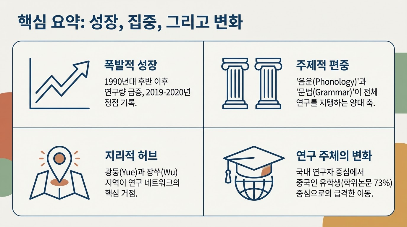 연구의 양적 성장을 넘어 질적 내용을 분석하는 것은 학문 공동체의 내재적 관심사와 발전 동향을 파악하는 핵심 과정입니다. 한국의 중국어 방언 연구는 전통적인 언어학 분야에 집중하면서도, 한국 학계만의 독자적인 연구 흐름을 형성하며 진화해 왔습니다.