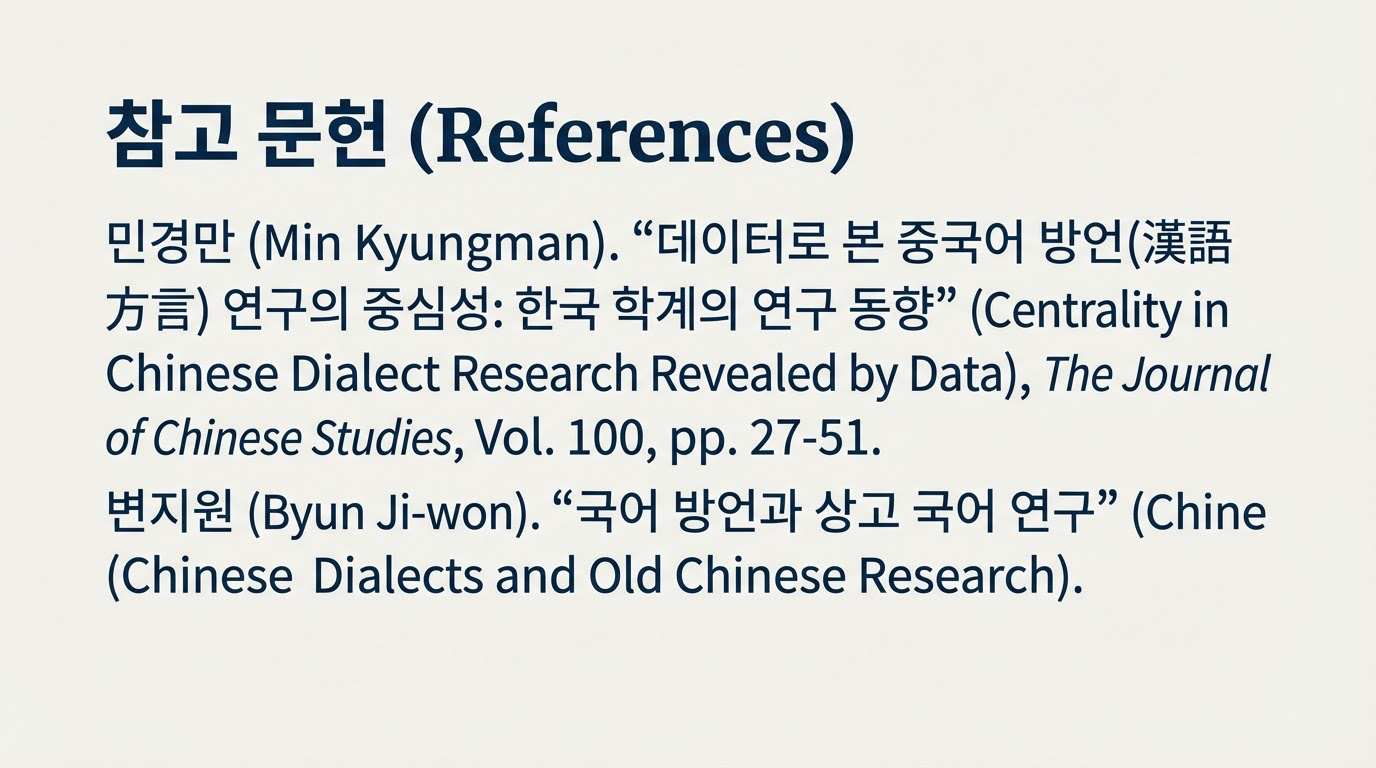 한국 학계의 중국어 방언 연구는 1990년대 후반 이래 괄목할 만한 양적 성장을 이루었으나, 이제는 질적 심화를 모색해야 할 결정적 전환점에 서 있습니다. 민경만(2024)의 최신 데이터 분석은 이러한 제 주장을 뒷받침하는 두 가지 구조적 한계—방법론의 정체와 연구 대상의 편중—를 명확히 보여줍니다.
