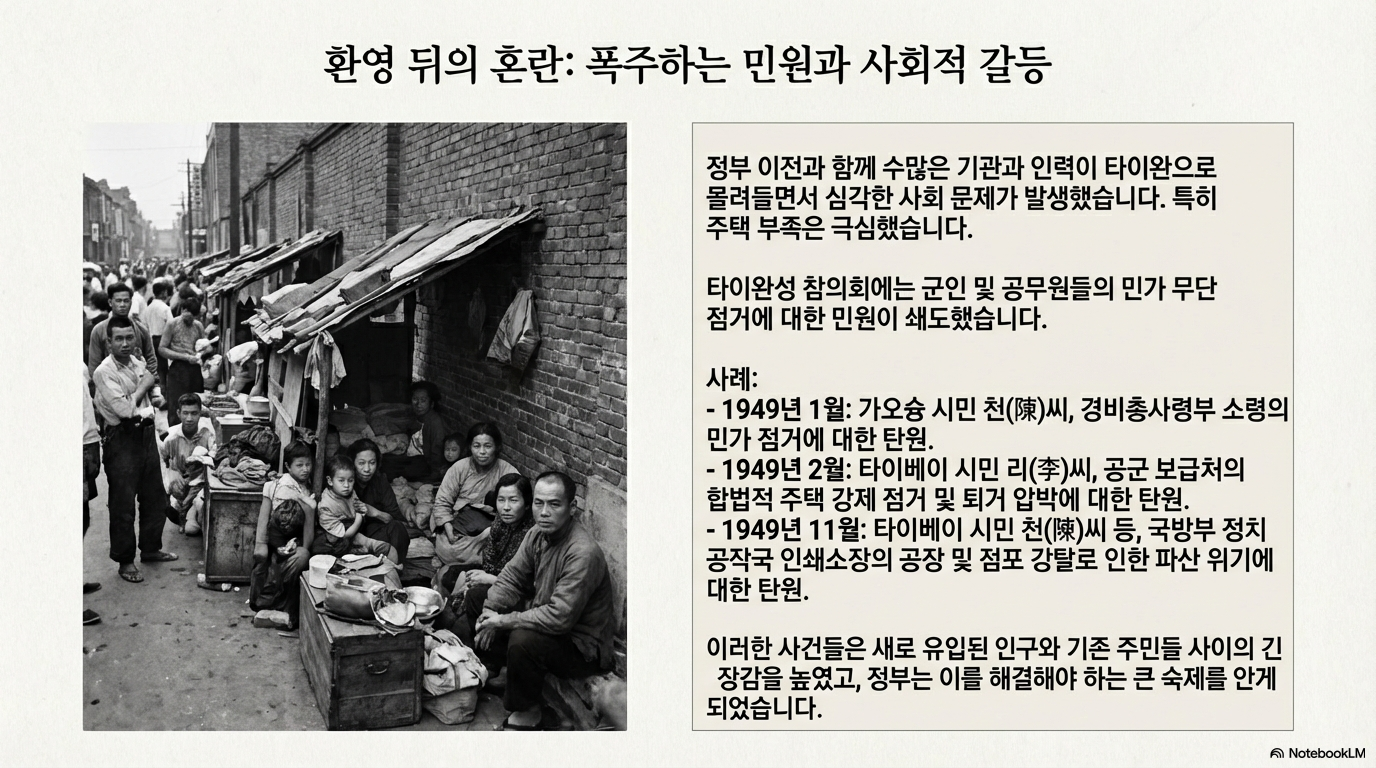 중앙정부의 이전은 타이완 사회에 수많은 실질적인 문제를 야기했습니다. 급증한 이주민과 이전 기관들로 인해 주택, 교육, 재산권 등 다양한 분야에서 갈등과 민원이 폭주했습니다. 이 시기 참의회는 거대 정치 담론뿐만 아니라, 격변기 민중의 고충을 해결하는 실무적인 창구 역할을 수행했습니다.