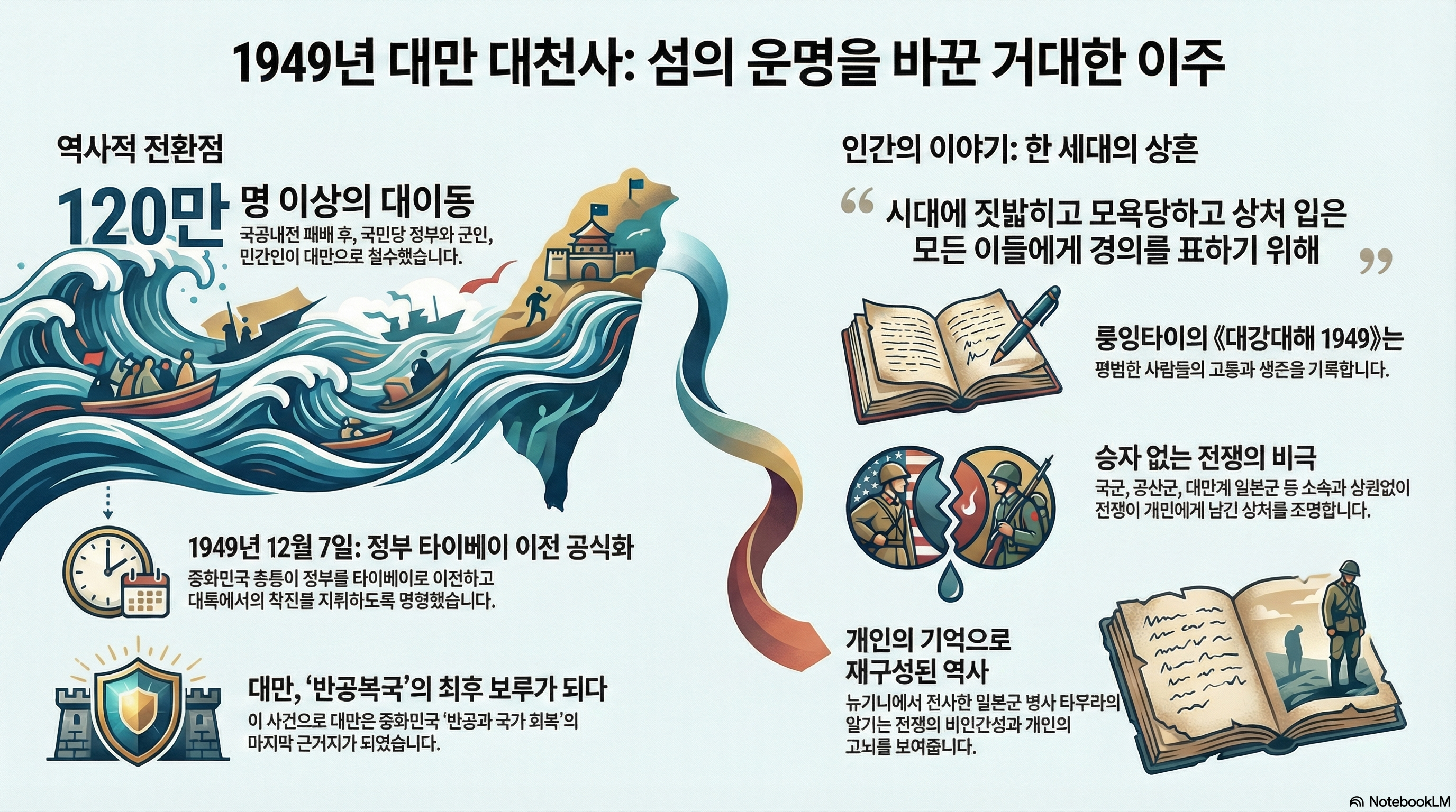 1949년 중국 대륙에서 타이완으로 이어진 120만 명 이상의 대규모 인구 이동, 즉 '대천동(大遷徙)'은 단순한 난민의 유입을 넘어 타이완의 현대사를 근본적으로 재편한 결정적인 사건이었습니다. 이 거대한 물결은 개인의 선택보다는 국공내전(國共內戰)이라는 거시적인 '구조적, 정치적 요인' 에 의해 촉발된 필연적인 결과였습니다. 이주민들은 타이완 사회의 인구 구조를 급격히 변화시켰을 뿐만 아니라, 그들이 가져온 정치 체제, 자본, 기술, 그리고 문화적 기억은 이후 반세기 동안 타이완의 정체성과 발전 경로를 규정하는 핵심 변수로 작용했습니다.
