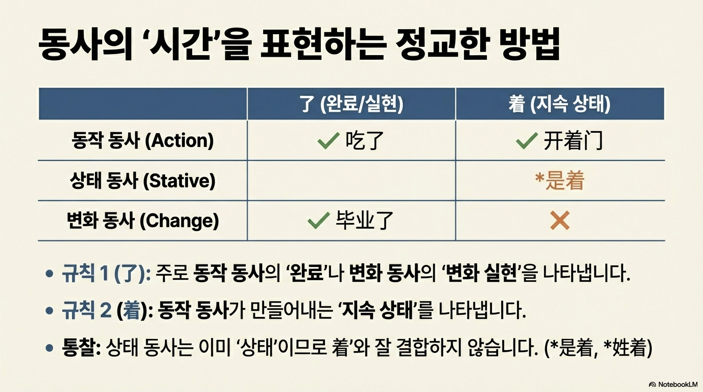 - 동태조사 了, 在, 着와의 결합: 吃(먹다), 跑(달리다)와 같은 동사를 통해, 在는 동작의 진행(我在吃飯。), 着는 동작 후 상태의 지속(門開着。), 了는 동작의 완료(我吃了飯。)를 나타냄을 명확히 구분하여 가르칩니다.