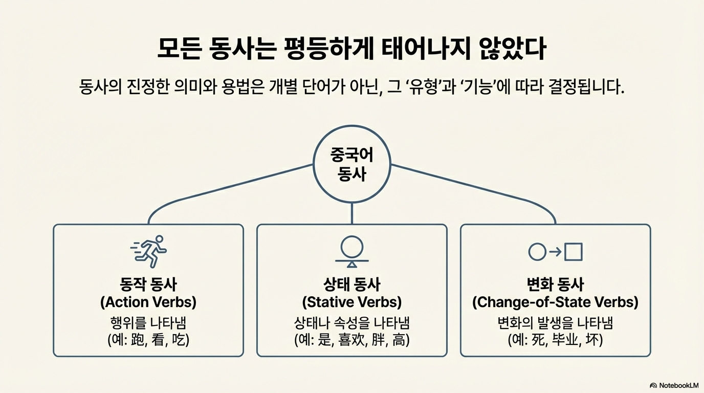 - 학습 목표: 동작, 상태, 변화 동사의 기본 개념을 이해하고, 각 범주를 대표하는 가장 기초적인 동사들을 익힙니다. (예: 吃, 是, 死)