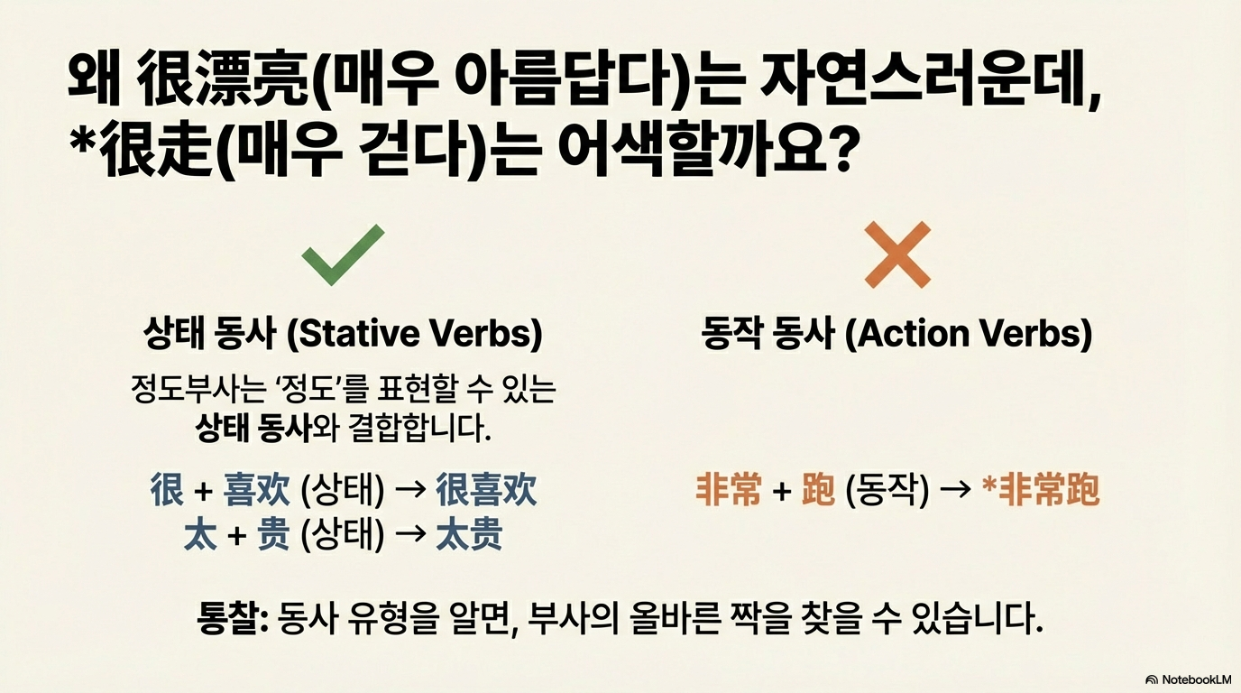 - 정도부사 很, 太, 非常 등과의 결합: 高興(기쁘다), 漂亮(예쁘다) 등의 동사가 정도부사의 수식을 받는 것이 가장 핵심적인 문법적 특징임을 강조합니다. 특히 很을 생략하면(他高, 我矮。) 비교의 의미가 발생한다는 점을 명확히 설명합니다.