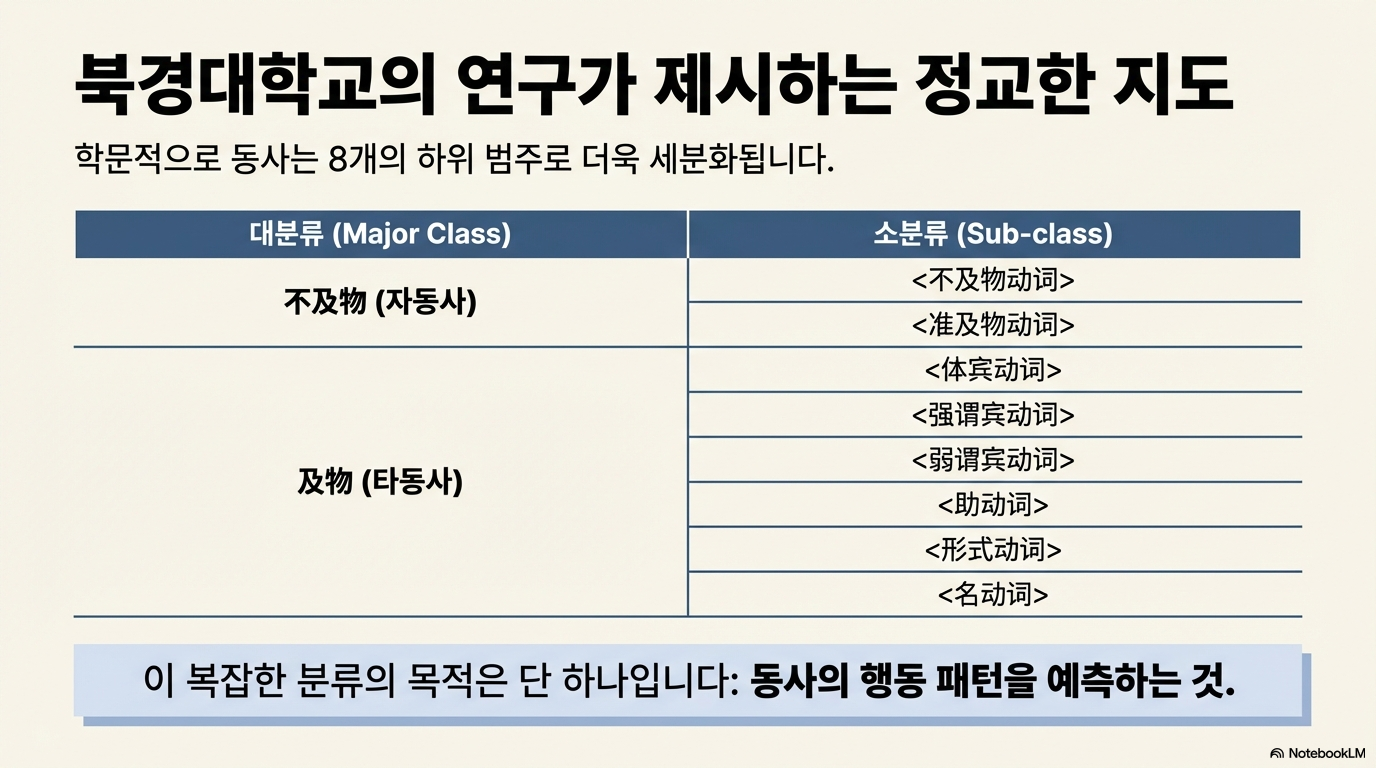 본 교재는 기존 이분법적 분류의 근본적인 한계를 극복하기 위해, 동사의 핵심 의미 특징인 '활동성(activeness)'과 '과정성(process)'을 기준으로 동사를 재분류하는 새로운 접근법을 채택합니다. 이 방법론은 동사가 단순히 단어의 나열이 아니라, 문장 전체의 구조를 결정하는 **'바닥판(Chassis)'**이자 다른 문장 성분을 끌어당기는 **'갈고리가 있는 원자'**와 같다는 언어학적 통찰에 기반합니다. 동사의 의미-기능적 특성을 중심으로 분류하면, 학습자는 복잡한 문법 규칙을 암기하지 않고도 직관적으로 올바른 문장 구조를 생성할 수 있게 됩니다.
